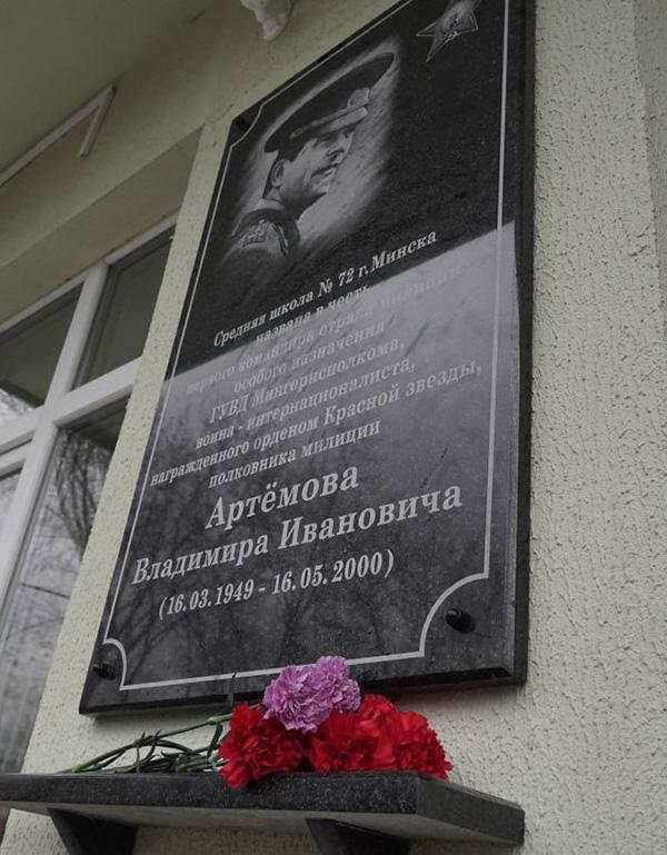 17 ноября состоялась церемония установки и открытия памятной доски и присвоения ГУО «Средняя школа № 72 г. Минска» имени первого командира отряда милиции особого назначения УВД Минского городского исполнительного комитета полковника милиции Владимира Ивановича Артёмова.