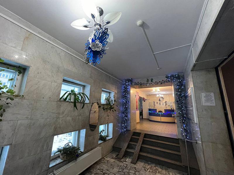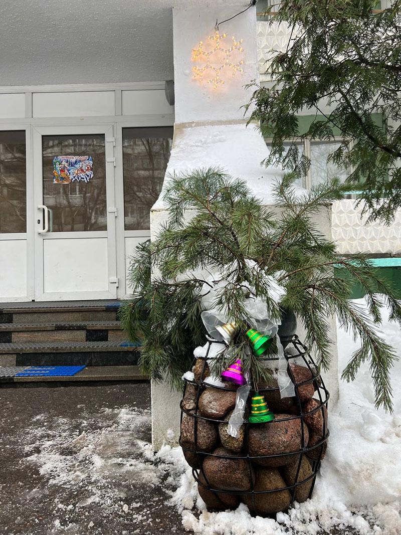 Входная группа общежития BKM Holding оформлена сверкающими гирляндами, декоративными вазами и плакатом с поздравлениями.