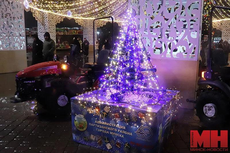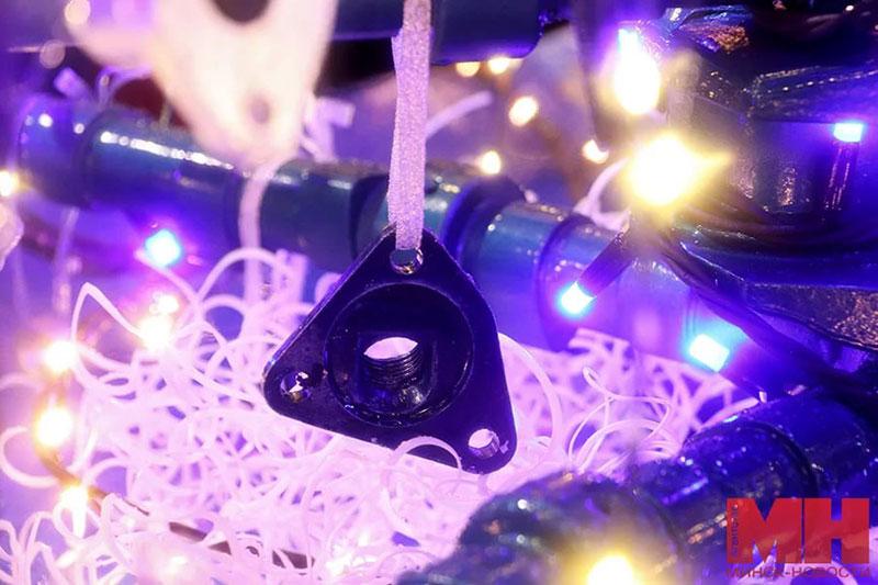 Ель выполнена из запасных частей, изготавливаемых на ММЗ, с использованием деталей МЗШ и МТЗ. На изготовление необычной новогодней красавицы — от сварки, обработки деталей до покраски — создателям потребовалось порядка двух месяцев.