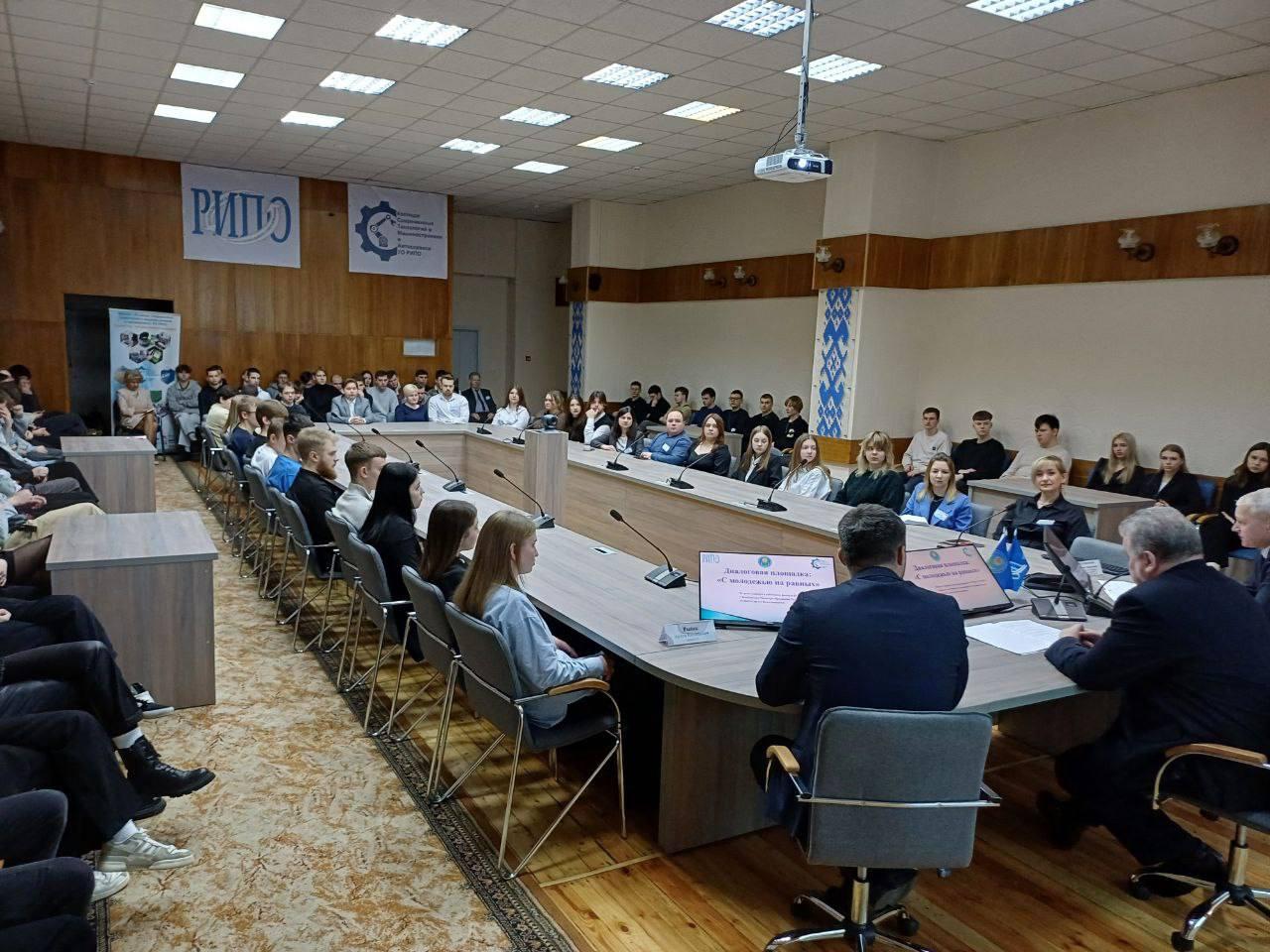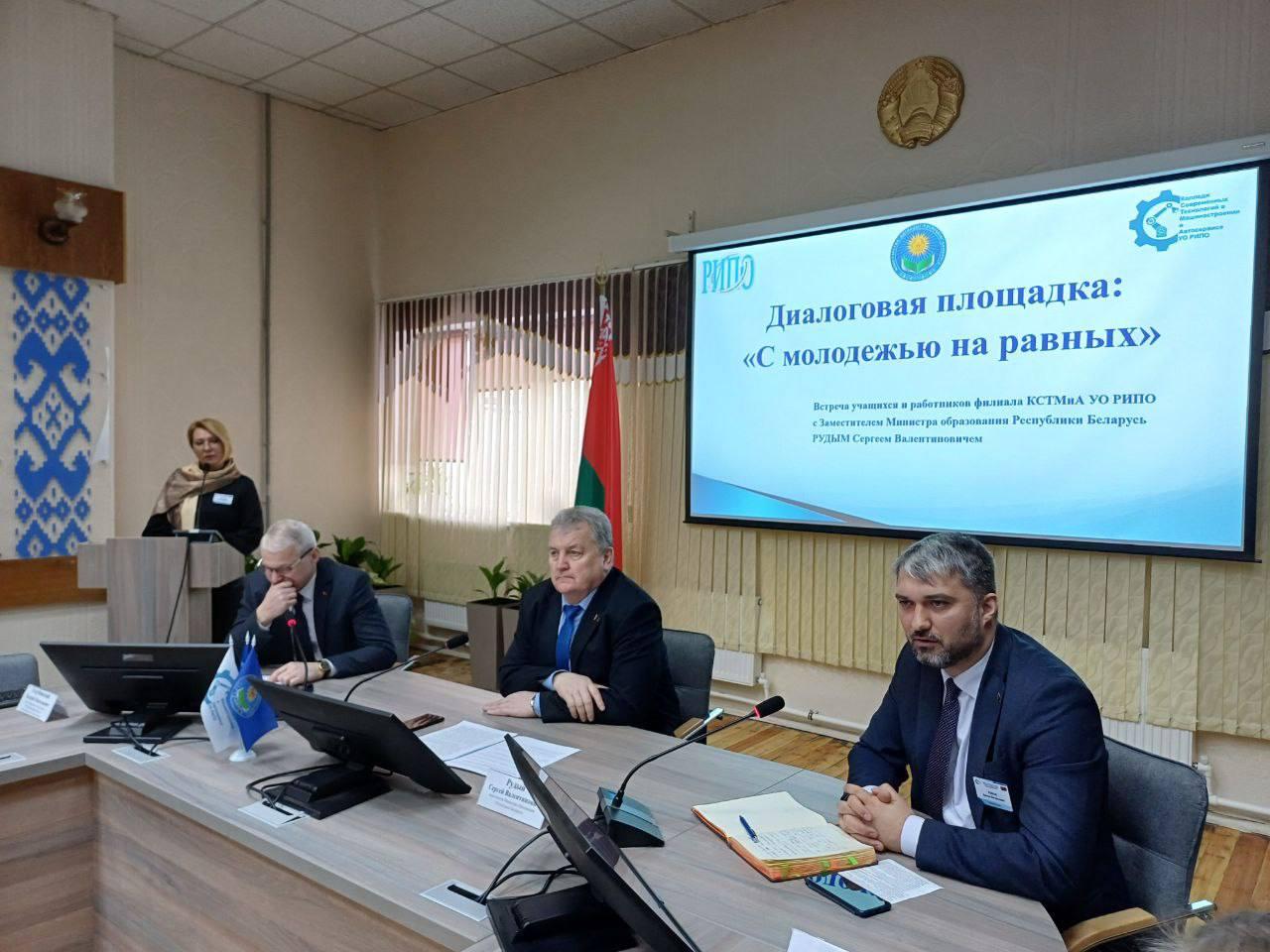 9 февраля в филиале КСТМиА УО РИПО состоялась диалоговая площадка: «С молодежью на равных». Учащиеся и молодые работники филиала встретились с заместителем Министра образования Республики Беларусь РУДЫМ Сергеем Валентиновичем и ректором УО РИПО Голубовским Валерием Николаевичем.