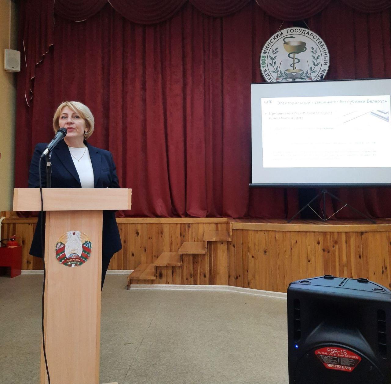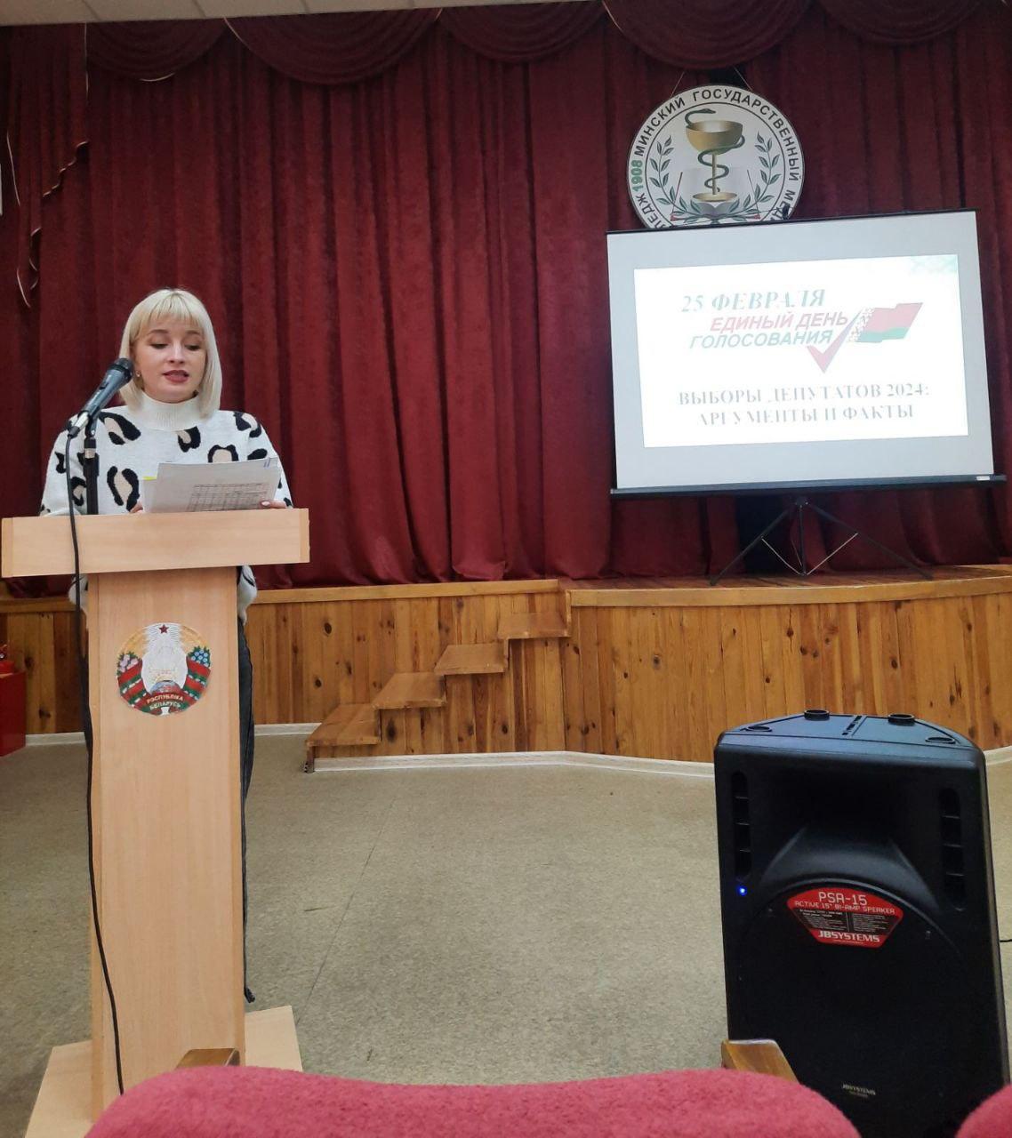 15.02.2024 в учреждении образования "Минский государственный медицинский колледж" прошел единый день информирования на тему" Выборы депутатов 2024: аргументы и факты" заместитель главы администрации Партизанского района - Филиппович Людмила Анатольевна рассказала сотрудникам и учащимся МГМК об основных аспектах электоральной кампании в Республике Беларусь.
