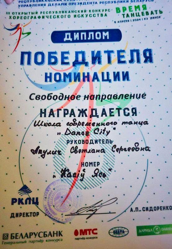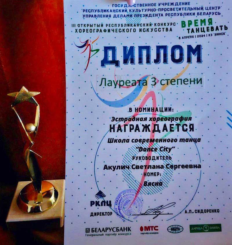 Танцевальный коллектив ЦДОДиМ «Виктория» - «DANCE CITY» (руководитель Акулич Светлана Сергеевна) принял участие в конкурсе в Номинации «Свободное направление». Коллектив стал Лауреатом I Степени, Лауреатом III Степени и Победителем Номинации с разными танцевальными композициями.