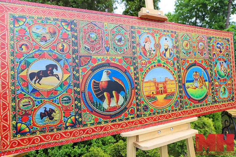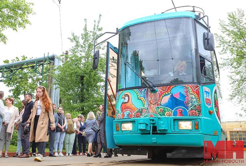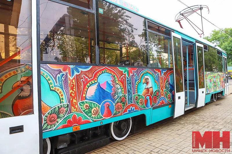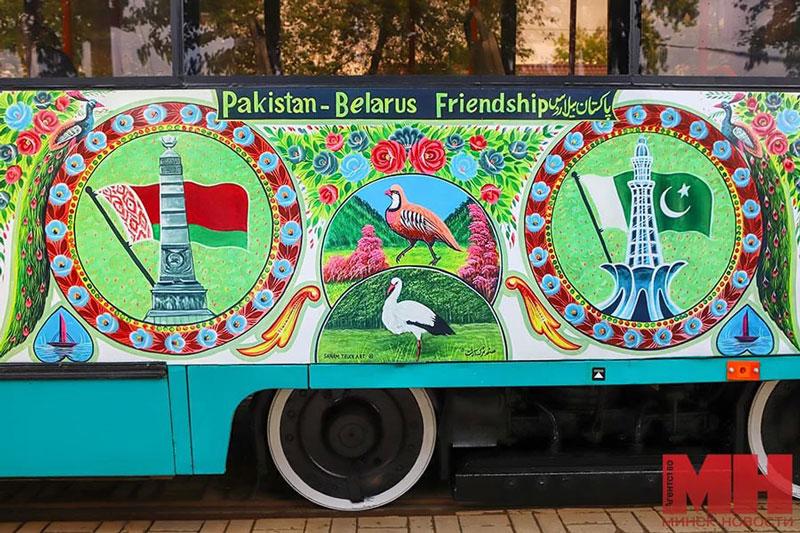 На кузове изображены национальные достопримечательности Беларуси и Пакистана и орнамент, благодаря чему трамвай стал значительно наряднее своих «коллег».