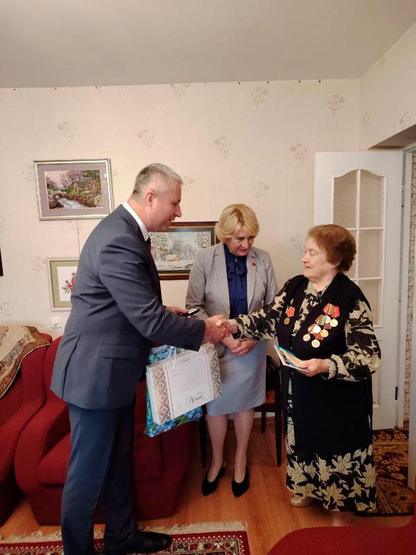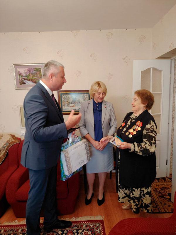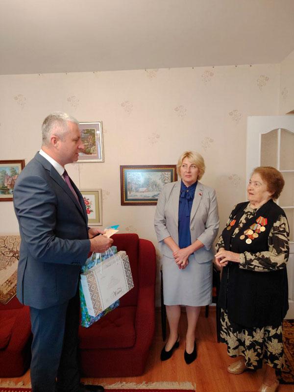 Глава администрации Партизанского района г. Минска ПОЛЯКОВ Николай Александрович, заместитель главы администрации Филиппович Людмила Анатольевна и начальник управления социальной защиты Петрова Светлана Иосифовна поздравили с Днем Независимости Республики Беларусь труженицу тыла Кудинову Антонину Наумовну.
