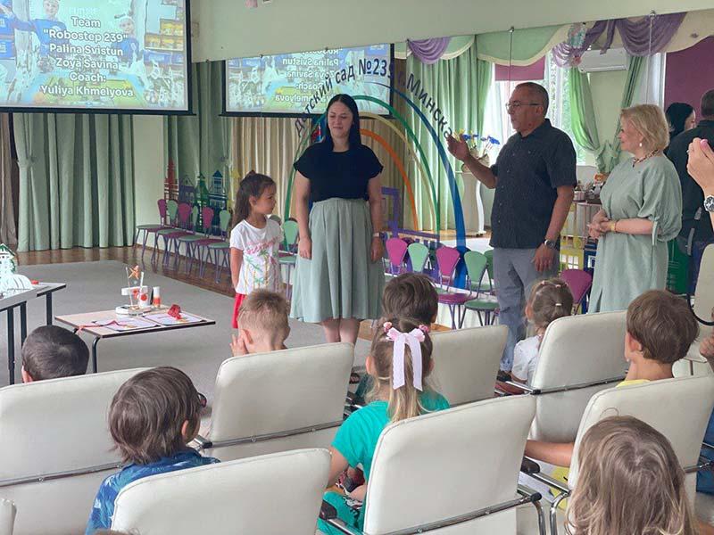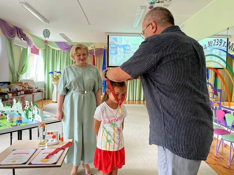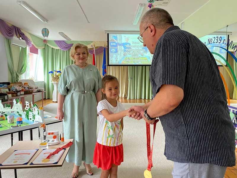 Официальный представитель Matata (кампания М-Робот в Республике Беларусь) в лице директора Игоря Масальского вручил команде Robotop 239 медали, кубок, дипломы и главный ценный подарок для детского сада – интеллектуальный микроскоп M1B, который педагоги планируют использовать в работе с воспитанниками в рамках проекта ЛАБОРАТОРИЯ ОТКРЫТИЙ.