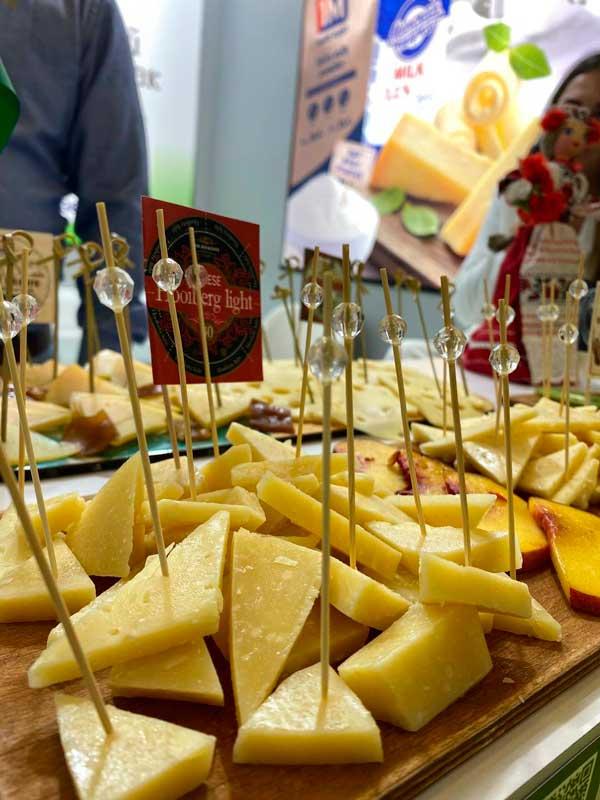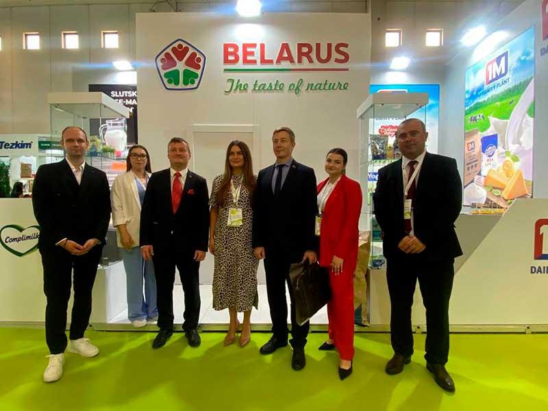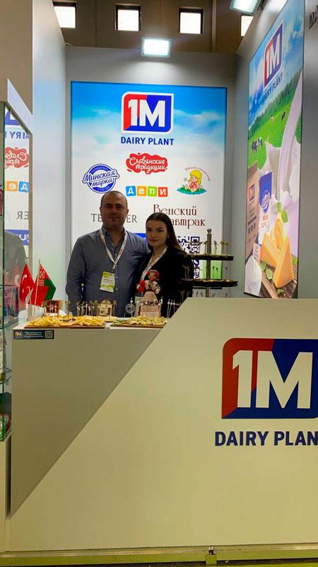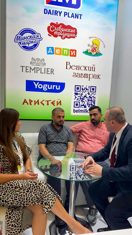 Заместитель генерального директора по коммерческим вопросам, начальник отдела диверсификации внешних рынков и заместитель начальника отдела маркетинга Первого молочного представляют продукцию предприятия на данной выставке.