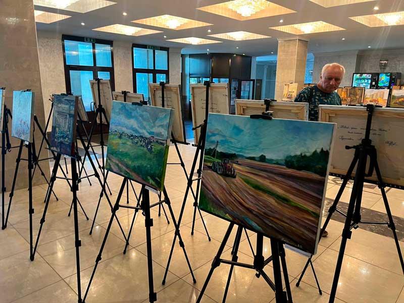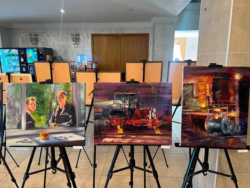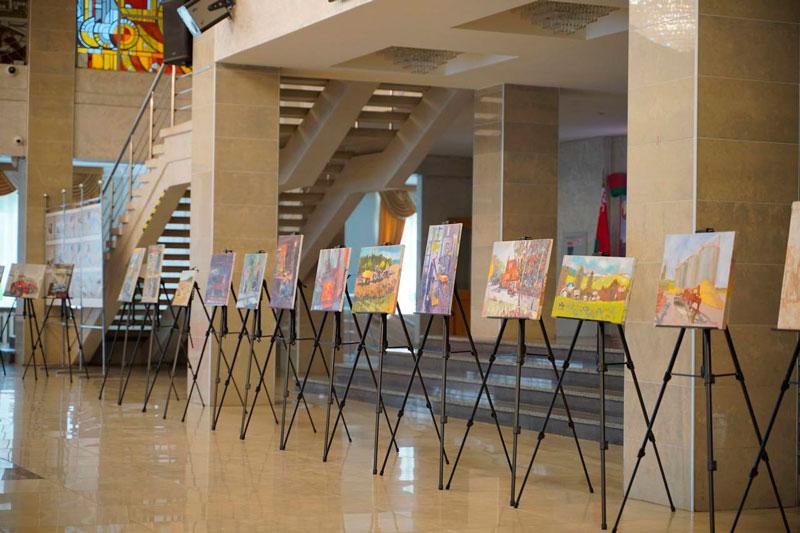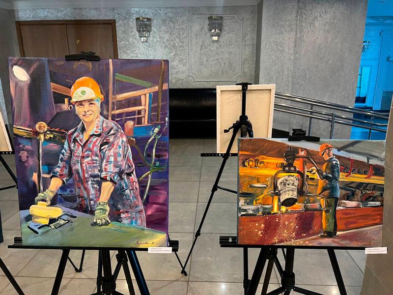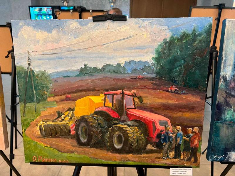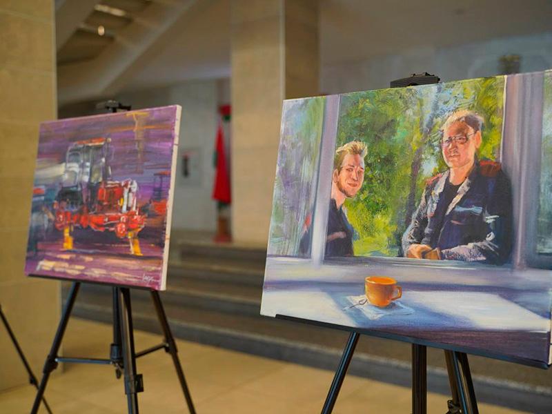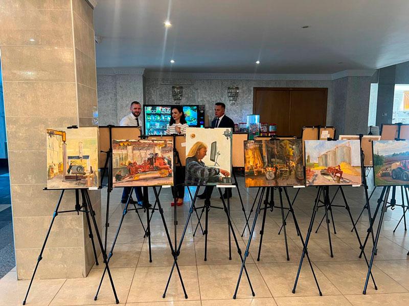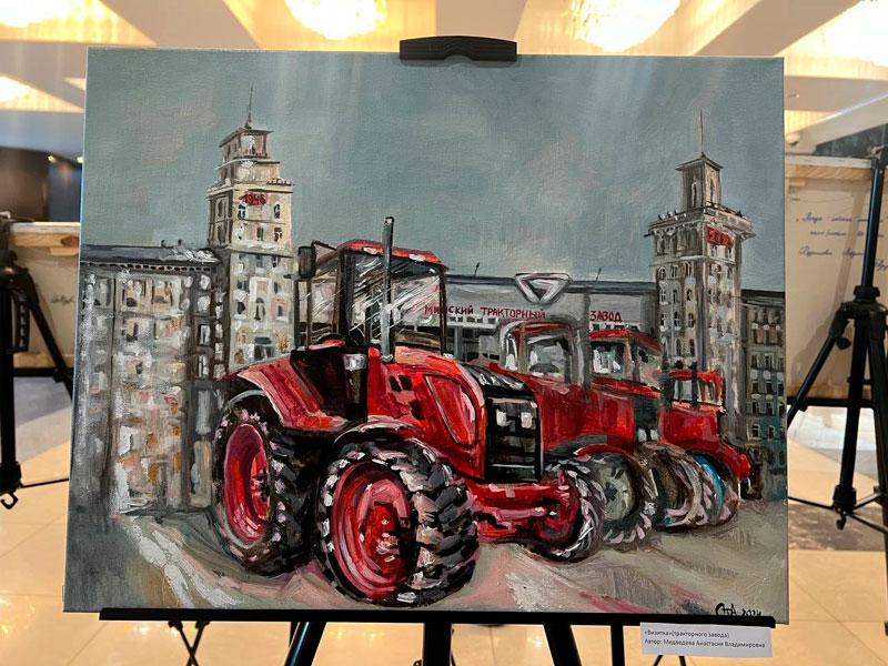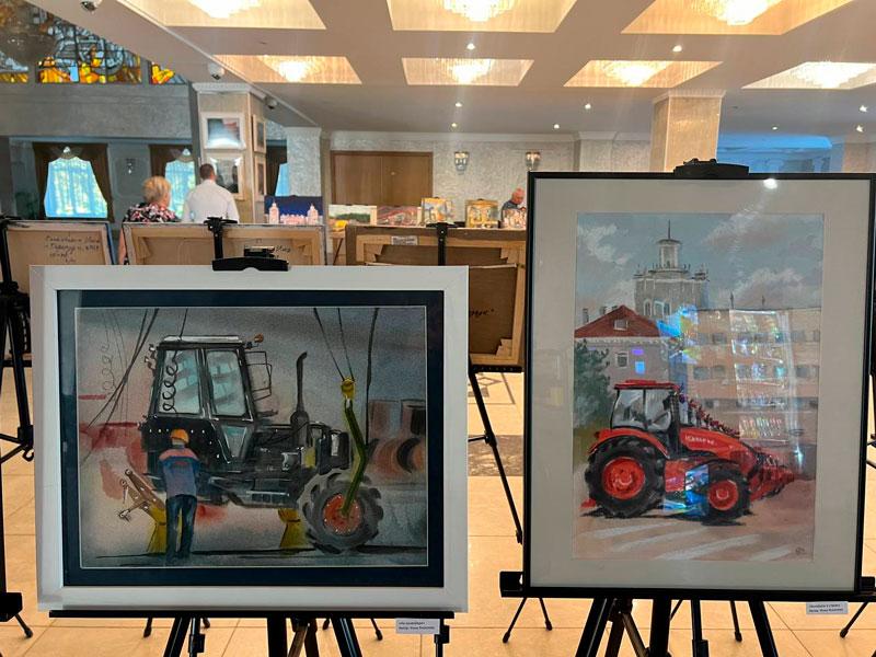 В экспозиции - работы художников-пленэристов из России и Беларуси, которые в августе несколько дней подряд рисовали цеха МТЗ.
