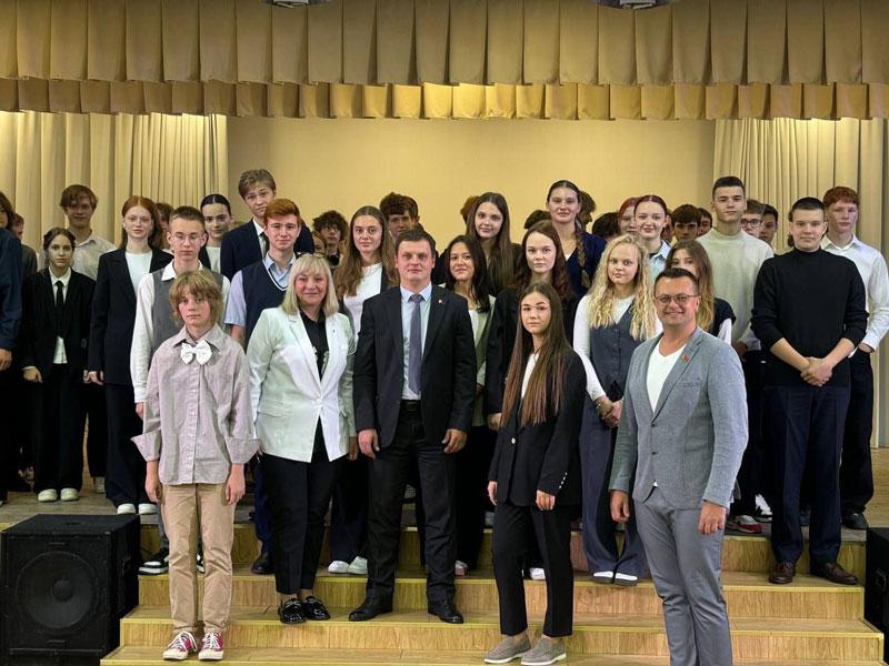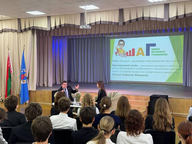 Алексей Ветошкин рассказал учащимся 10-11 классов о вопросах реализации молодежной политики в Республике Беларусь, подробно остановился на роли молодежных организаций и объединений в формировании гражданского общества. Формат встречи был организован по принципу «100 вопросов взрослому». Ребят интересовали вопросы экологии, получения высшего образования, занятие научно-исследовательской деятельностью, механизм финансирования научных тем и программ, а также прозвучали вопросы об увлечениях в свободное время, любимых местах нашей страны, жизненном девизе.