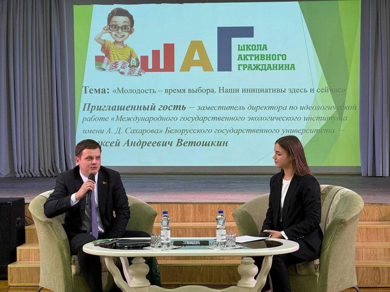 Член Молодежного совета при Минском городском совете депутатов, заместитель директора по идеологической работе МГЭИ им.А.Д.Сахарова БГУ Алексей Ветошкин принял участие в работе информационно-образовательного проекта «ШАГ» – «Школа Активного Гражданина» в ГУО «Гимназия № 5 г. Минска имени героев встречи на Эльбе».