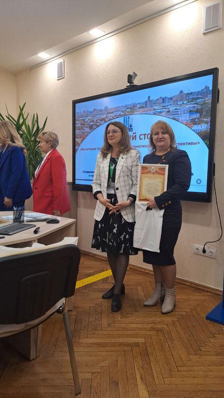 Наряду с представителями института свой опыт работы по формированию основ духовно-нравственной и гражданско- патриотической культуры детей дошкольного возраста "Растим маленького патриота" представила Шиндюк Мария Викторовна, заведующий ГУО «Детский сад №2 г.Минска».