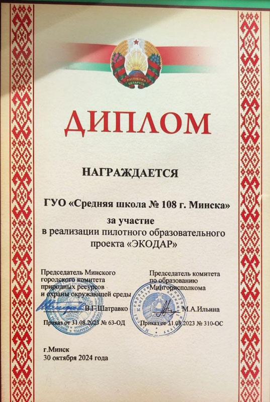 Школа была награждена дипломом за участие в реализации пилотного образовательного проекта #ЭКОДАР.