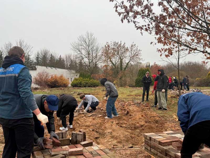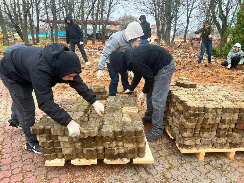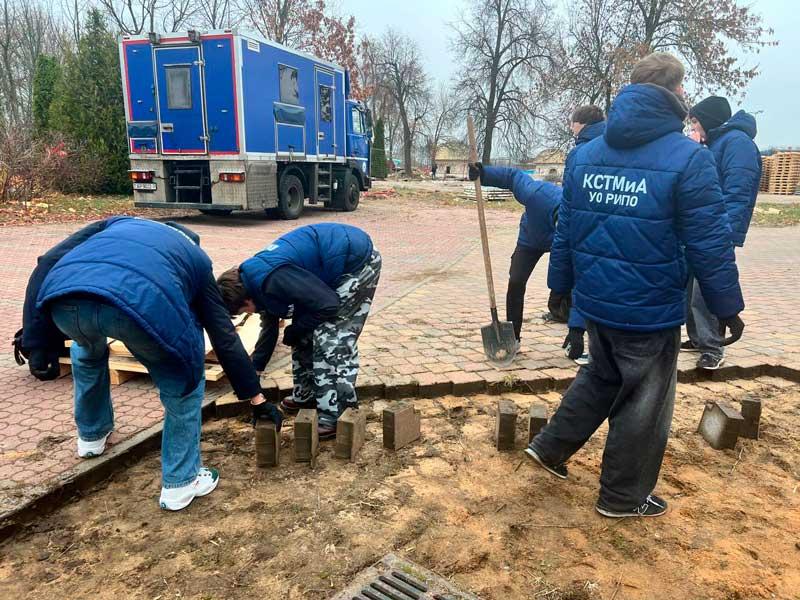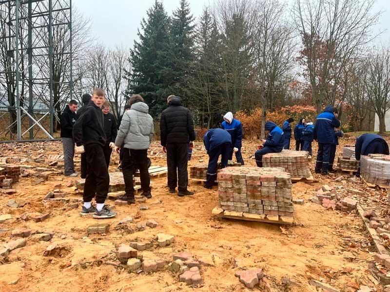 Сегодня молодежный актив Партизанского районного комитета ОО «БРСМ» помогает строителям навести порядок, очистить территорию от старой плитки и погрузить ее на поддоны.