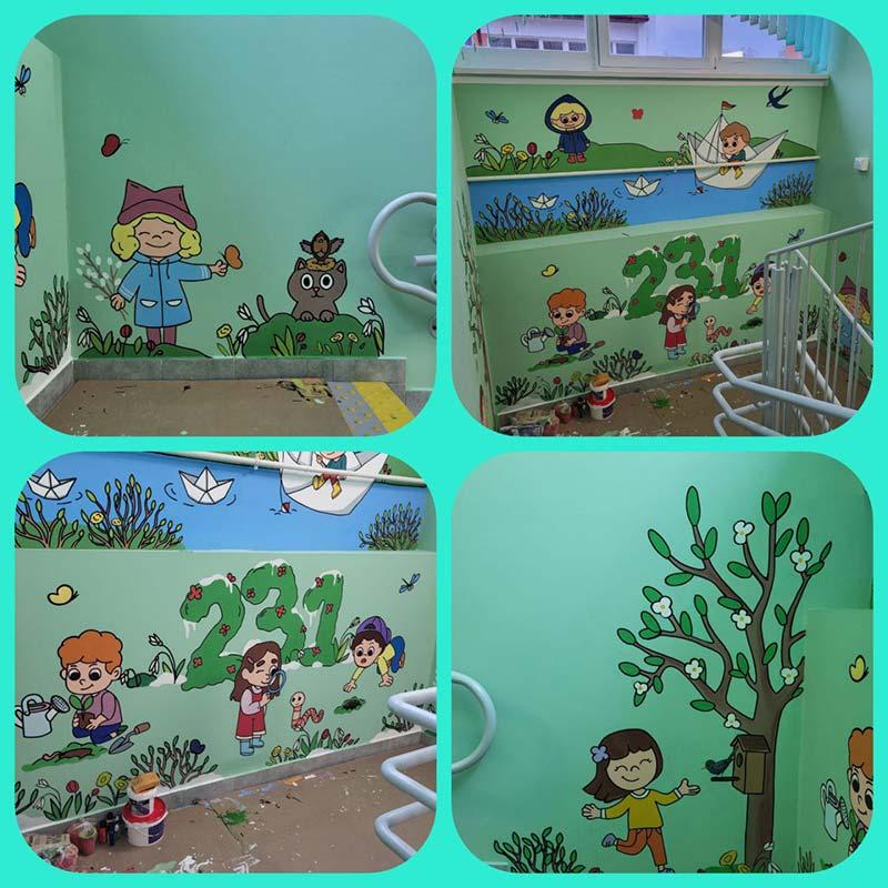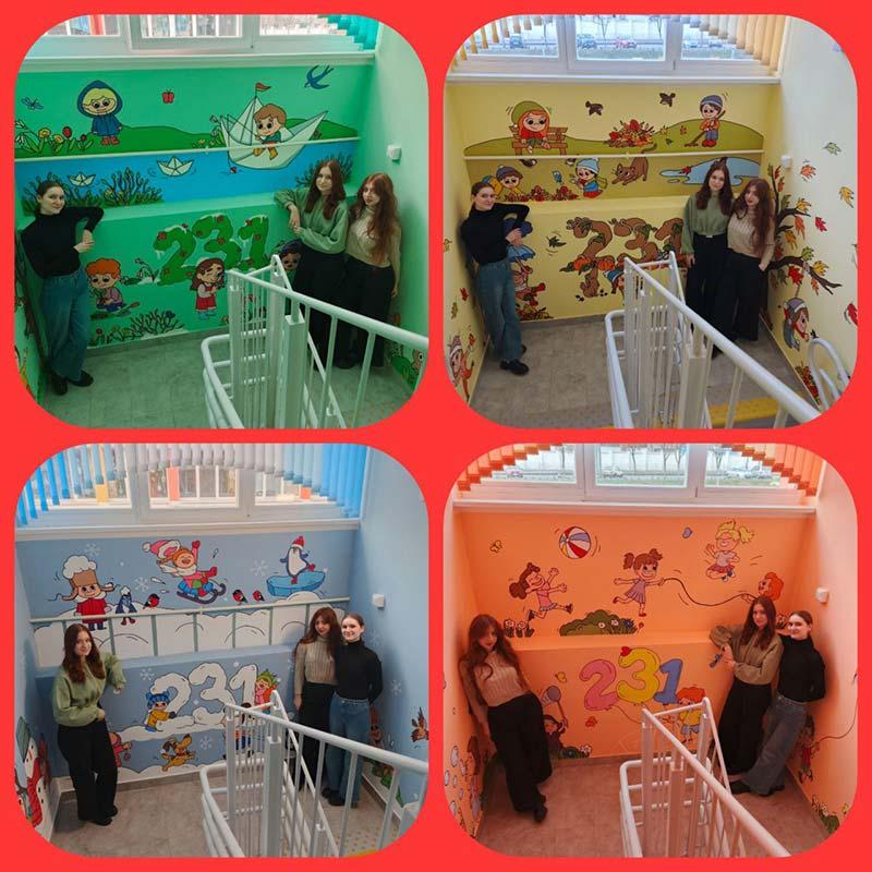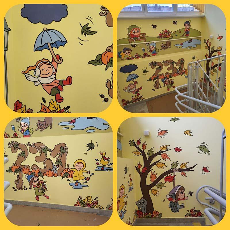 Эскизы получились красочными и привлекательными, и никого равнодушными не оставили. В них отражены игры и забавы детей в разные поры года. Росписи оживили интерьеры лестниц, стали эксклюзивом детского сада.