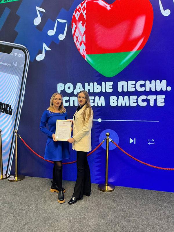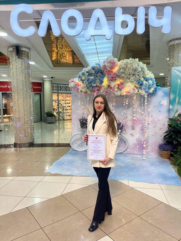 Благодарностью за добросовестный труд и значительный вклад в развитие Партизанского районного комитета Общественного объединения «Белорусский республиканский союз молодежи» г.Минска награждена Скребец Вероника Сергеевна - ведущий юрисконсульт ОАО «Кондитерская фабрика «Слодыч».