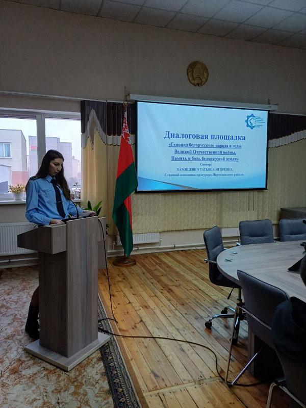 Спикером выступила Т.И. Хамицевич старший помощник прокурора Партизанского района. Она раскрыла ряд вопросов о геноциде в период ВОВ, а так же подробно ознакомила молодежь о работе, которая ведется прокуратурой на современном этапе по делам о геноциде против белорусского народа "без срока давности".