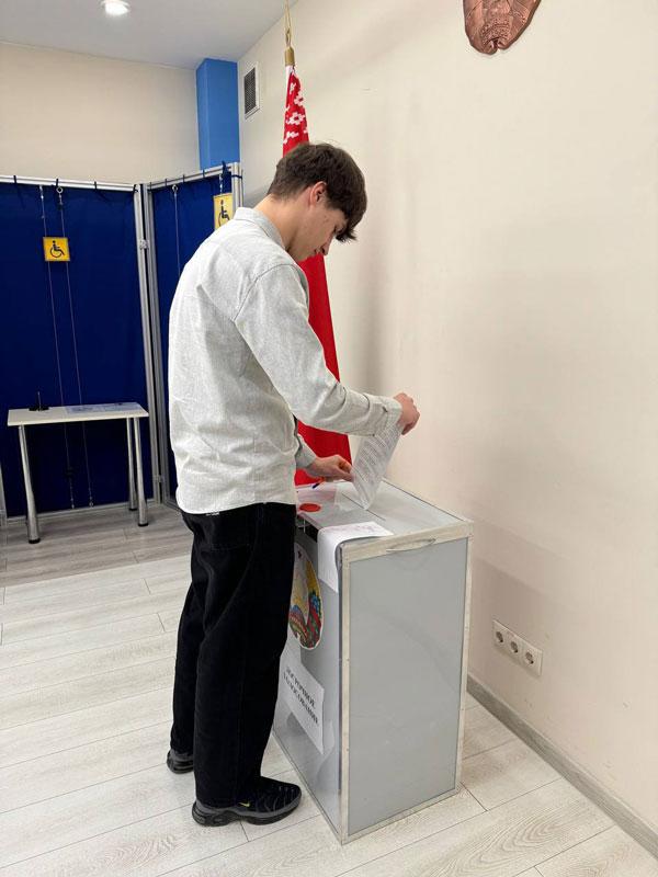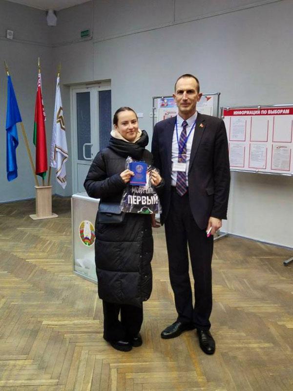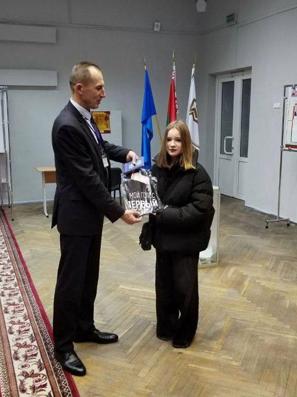 В рамках акции «Твой голос первый» впервые голосующих на избирательных участках встретили памятными подарками: издание «Символы суверенной Беларуси» и майки от Белорусского республиканского союза молодежи.
