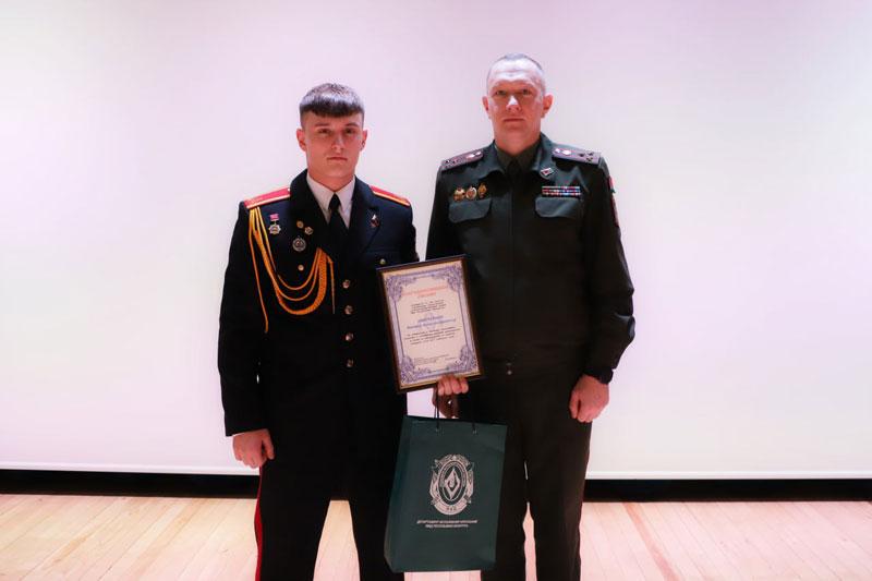 От имени начальника ДИН Олега Маткина заместитель начальника управления идеологической работы и кадрового обеспечения департамента Андрей Дмитравцов в торжественной обстановке вручил благодарственные письма и подарки десятерым учащимся Специализированного лицея МВД. Учащиеся отличились высокими результатами в учёбе по итогам второй четверти.