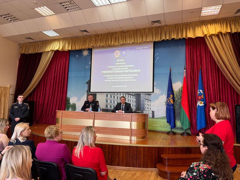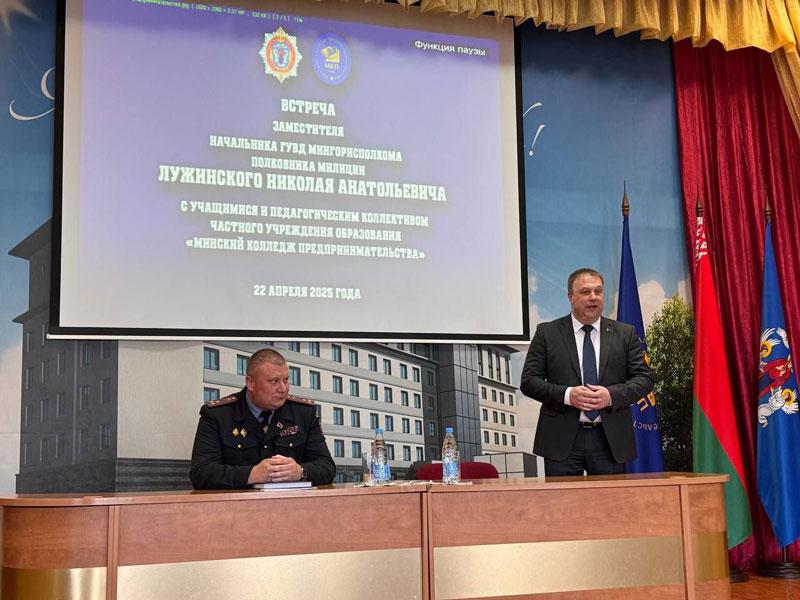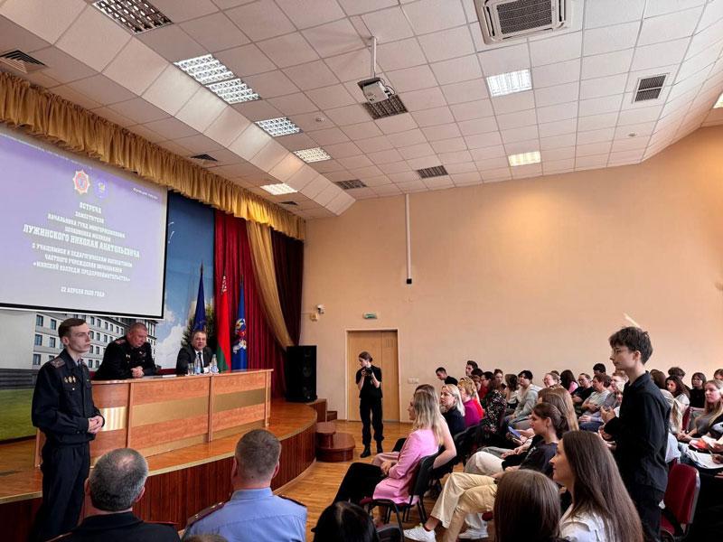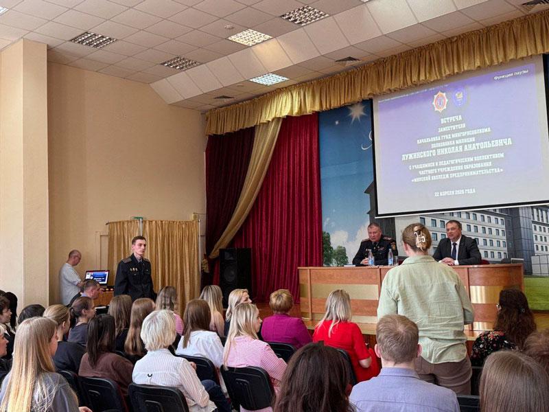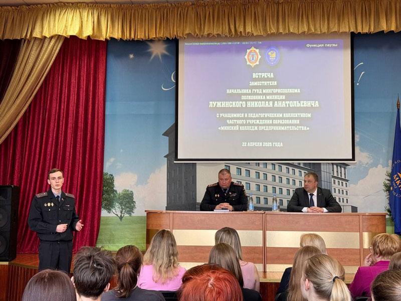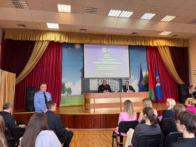 В колледже состоялась встреча заместителя начальника ГУВД Мингорисполкома полковника милиции Николая Анатольевича Лужинского и представителей столичной милиции с трудовым коллективом и учащейся молодёжью.