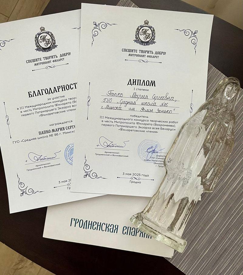 Папко Мария Сергеевна, учитель русского языка и литературы, стала победителем III Международного конкурса творческих работ в честь Митрополита Филарета (Вахромеева), первого Патриаршего Экзарха всея Беларуси «Филаретовские чтения» в городе Гродно.