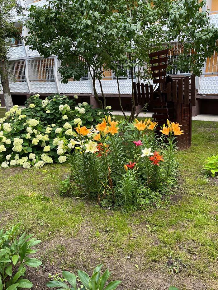 Цветочные арки и клумбы: Территория утопает в зелени и цветах! Красота, которая радует глаз и создает уютную атмосферу.