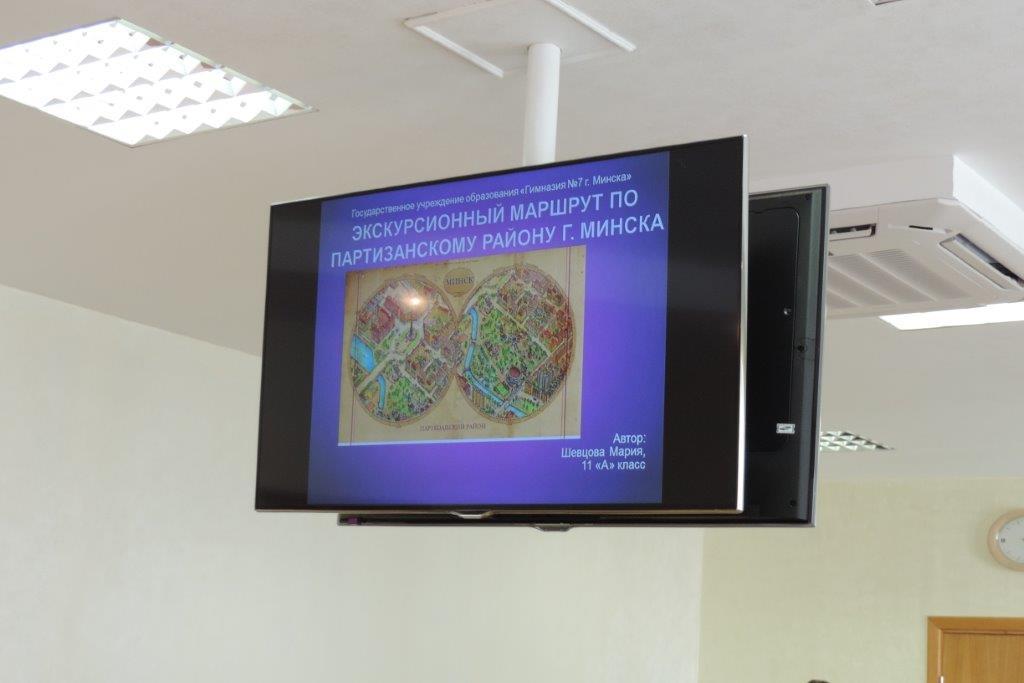Начался урок с презентации о Партизанском районе города Минска, которая была подготовлена Марией Шевцовой, победительницей заключительного этапа республиканской олимпиады по английскому языку, учащейся 11 "А" класса гимназии.