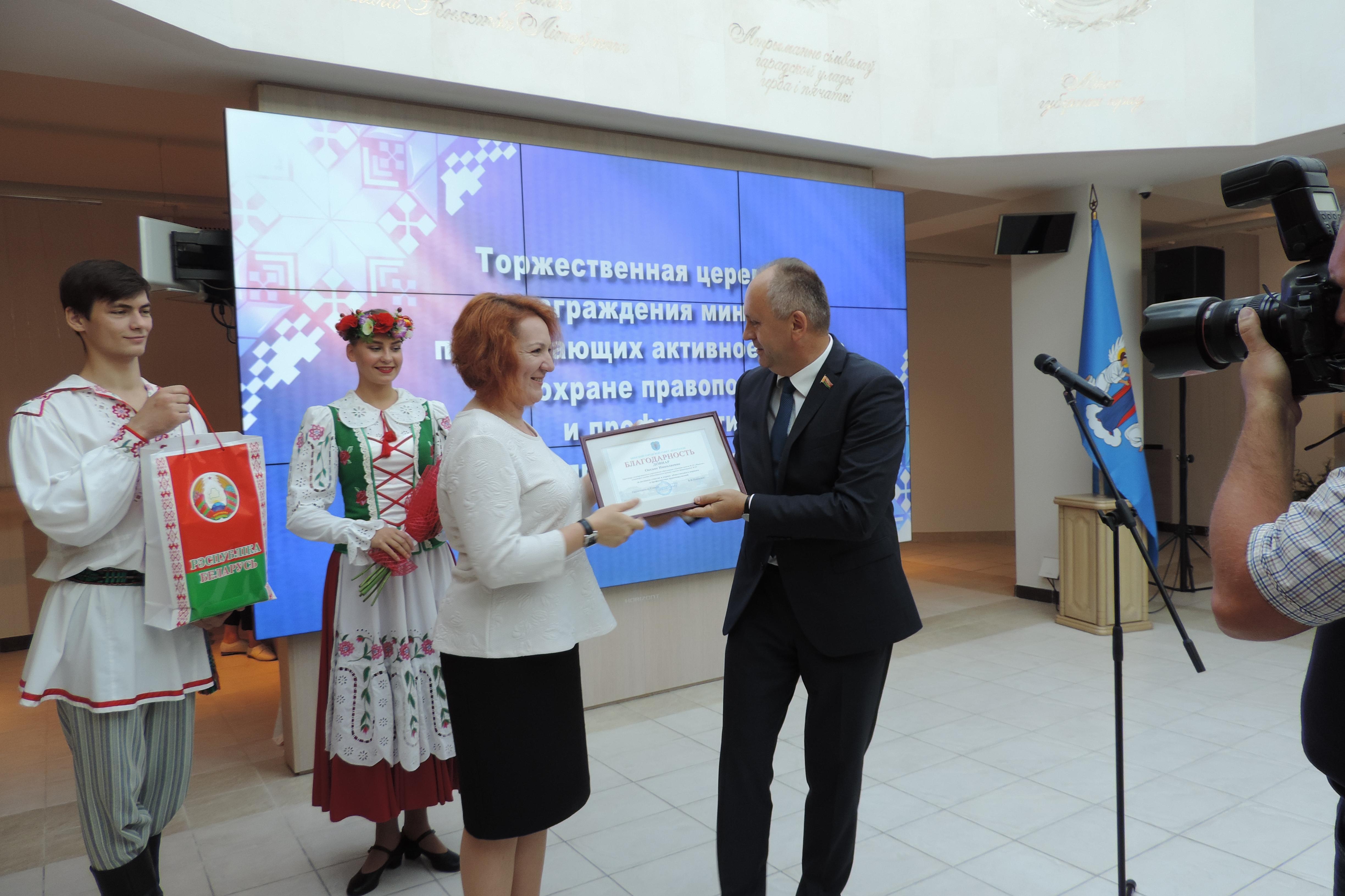 Во время церемонии в адрес виновников торжества прозвучало немало слов признательности за их труд от почетных гостей, среди которых — председатель Минского городского Совета депутатов Панасюк В.В., заместитель председателя Мингорисполкома Юркевич И.В., прокурор города Минска Хмарук С.К., начальник главного управления внутренних дел Мингорисполкома Дорошко С.И., начальник главного управления идеологической работы и по делам молодежи Мингорисполкома Шендик С.Н.