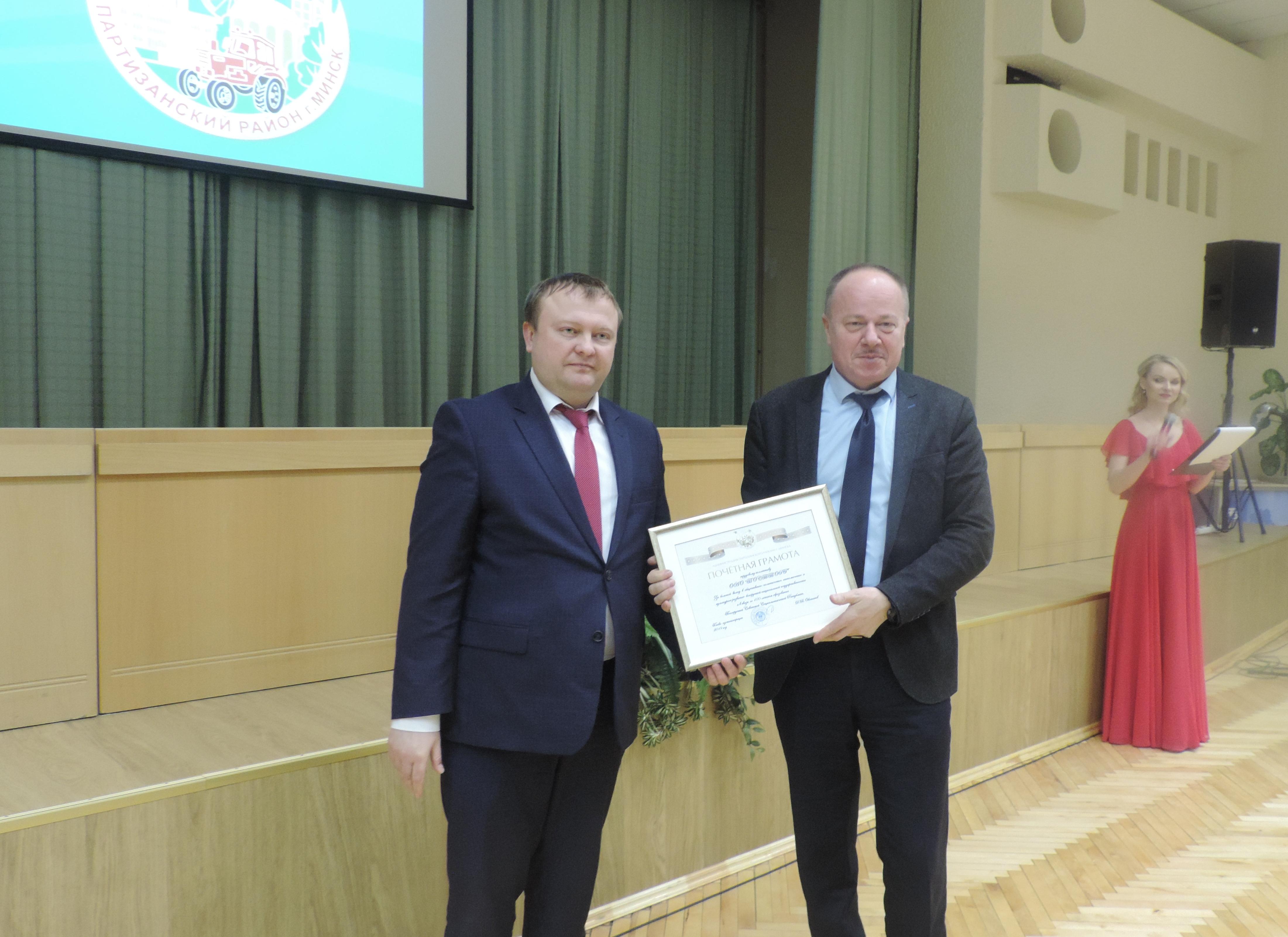 За большой вклад в общественно-политическое, экономическое и культурное развитие белорусской национальной государственности и в связи со 100-летием образования БССР Почетными грамотами администрации Партизанского района города Минска были награждены трудовые коллективы ОАО «МТЗ», ОАО «МЭТЗ им. В.И. Козлова», УП «Минскводоканал», ОАО «ПОСТТОРГ», ОАО «УКХ «ММЗ», УЗ «6-я ГКБ», ОО «Белорусское общество дружбы и культурной связи с зарубежными странами», ГУО «ЦДОДиМ «Виктория» г.Минска».