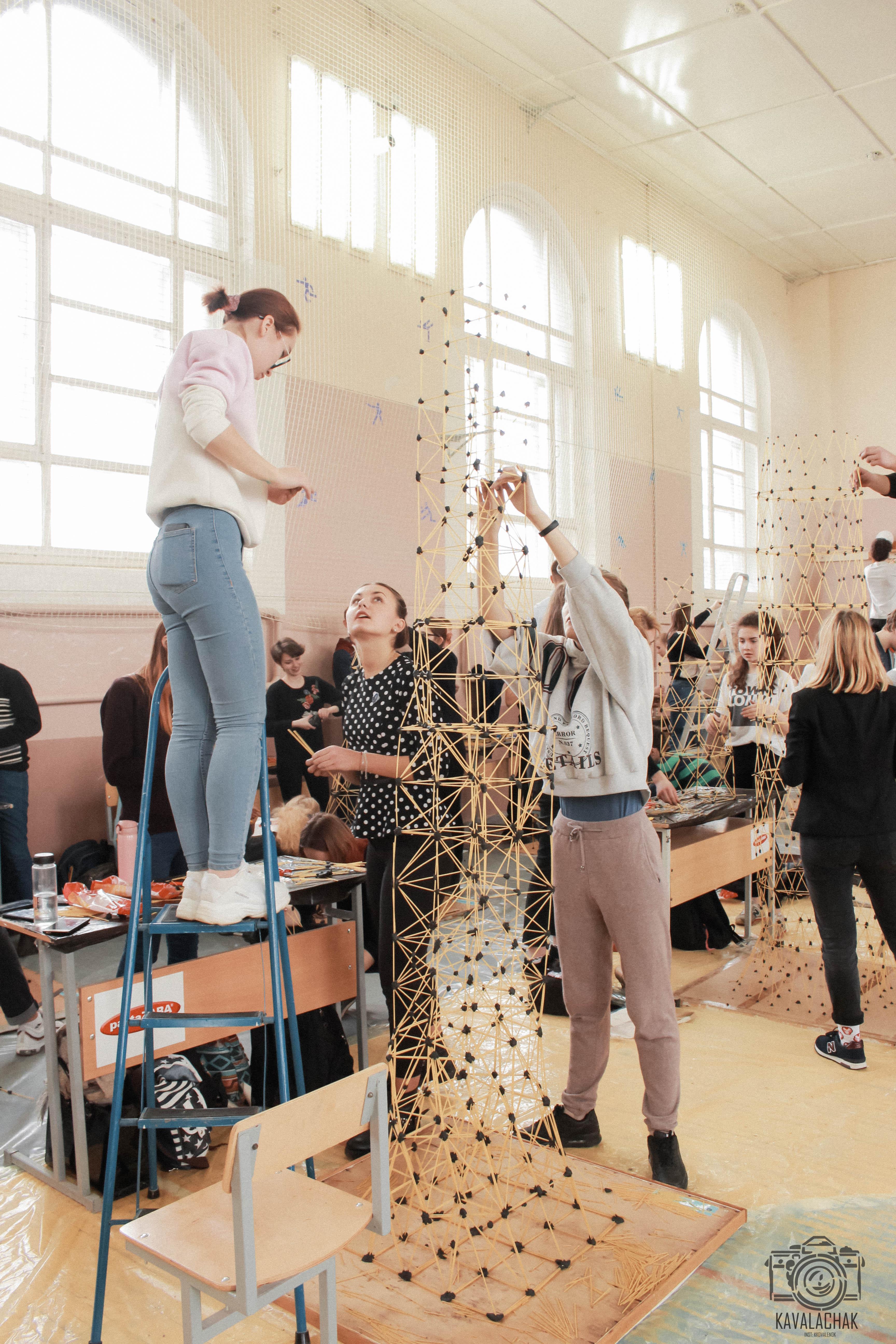 Одинаковые материалы были выданы каждой команде в объеме: 1,5 кг макарон спагетти и 1 кг скульптурного пластилина, а вот как этим распоряжаться уже решали конкурсанты. Кто-то по специально подготовленному проекту сразу заготовил «блоки», а потом все скреплял, кто-то руководствовался интуицией и строительными навыками, а кто-то занял позицию лидера и внимательно контролировал «стройку», раздавал указания и проверял прочность сооружения.