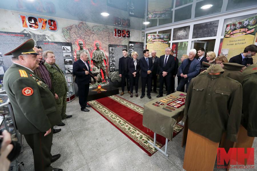 Экспозиция насчитывает порядка 100 экспонатов. В их числе оригинальные письма фронтовиков, трофейные гильзы, патроны, миномет, образцы обмундирования. Свой военный китель передал школьному музею и директор Департамента контроля качества образования Михаил Мирончик, в свое время также исполнивший интернациональный долг в Афганистане.