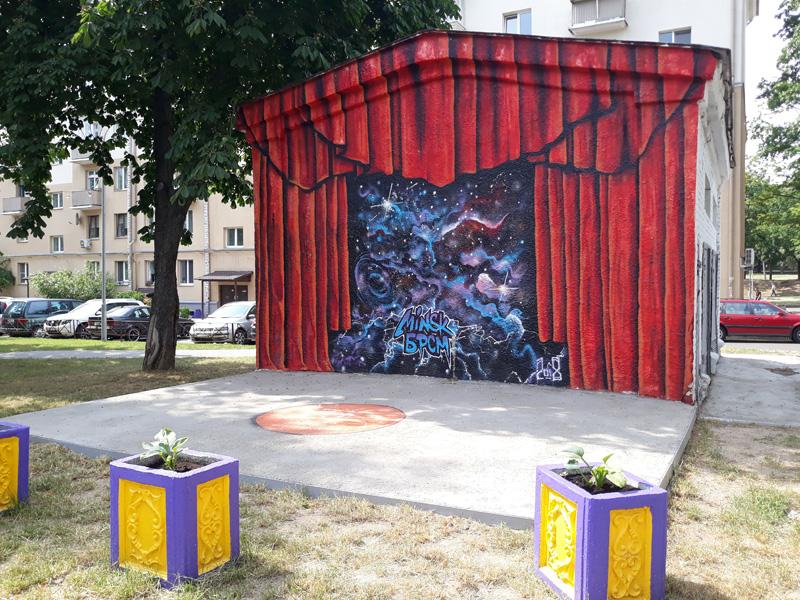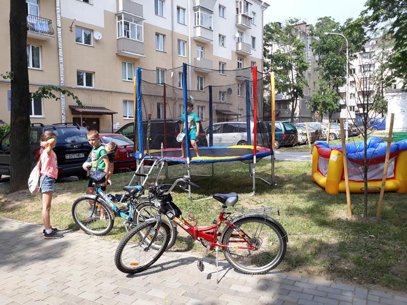 Председатель КОТОС-46 Партизанского района Елена Кухарчик ведет дальше по своим владениям. Для маленьких жителей общественники приобрели батуты, которые местной детворе очень полюбились. Для проведения праздников двора организовали сцену. Основой послужила трансформаторная будка.