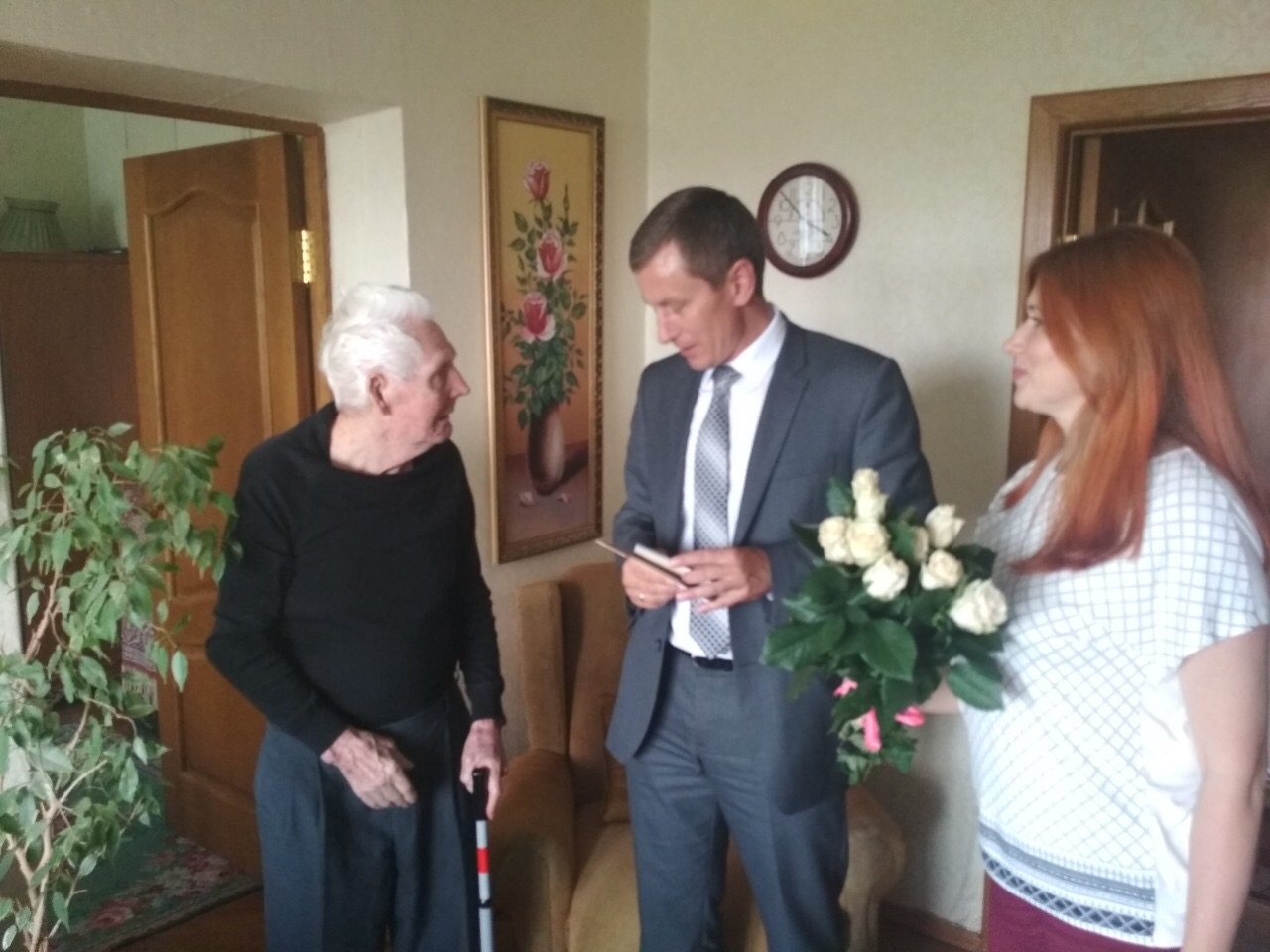 Накануне Дня Республики и 75-летия освобождения Минска глава администрации Партизанского района г.Минска Вороницкий Валерий Викторович посетил на дому Героя Советского Союза - Кустова Ивана Ильича, совместно с заместителем главы администрации Кудермаевым А.Н., начальником управления социальной защиты Петровой С.И., директором ГУ "Территориальный центр социального обслуживания населения Партизанского района г.Минска" Пархоменко Е.П.