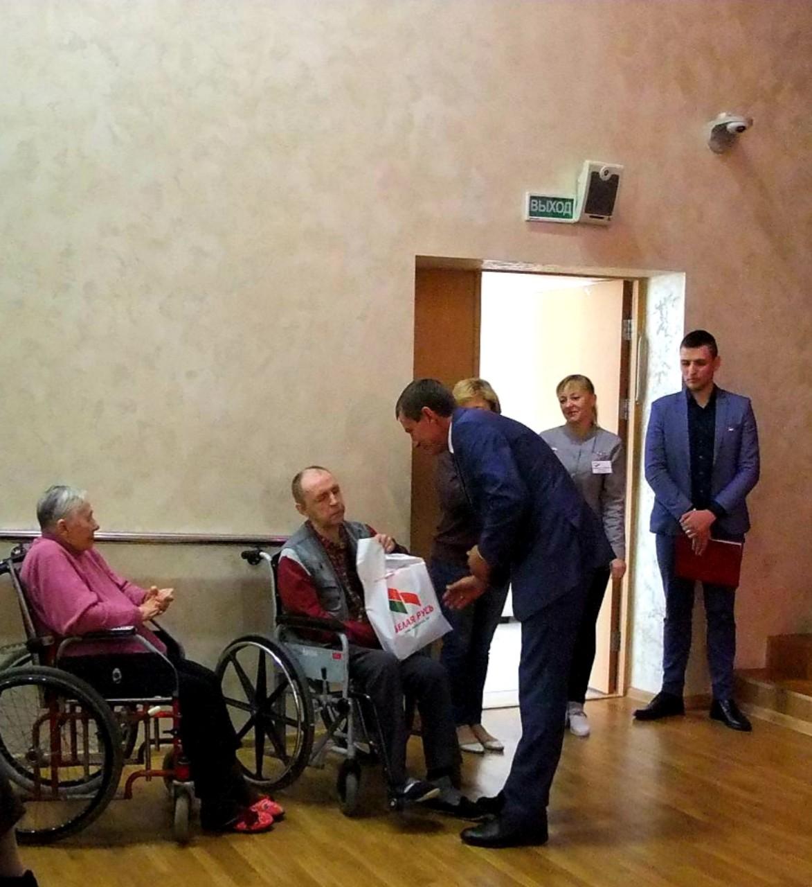 Ежегодно в первый день октября в нашей стране, как и во многих других, отмечается День пожилых людей. В этот день глава администрации Валерий Викторович Вороницкий совместно с представителями Партизанской районной организации РОО «Белая Русь» посетили жителей государственное учреждение «Дом интернат для пенсионеров и инвалидов», расположенный на территории района по ул. Ваупшасова, д. 33. Валерий Викторович выразил благодарность пожилым людям за вклад в развитие нашего города и района, за многолетний добросовестный труд, пожелал крепкого здоровья и долгих лет жизни, а также поздравил и вручил подарки юбилярам.