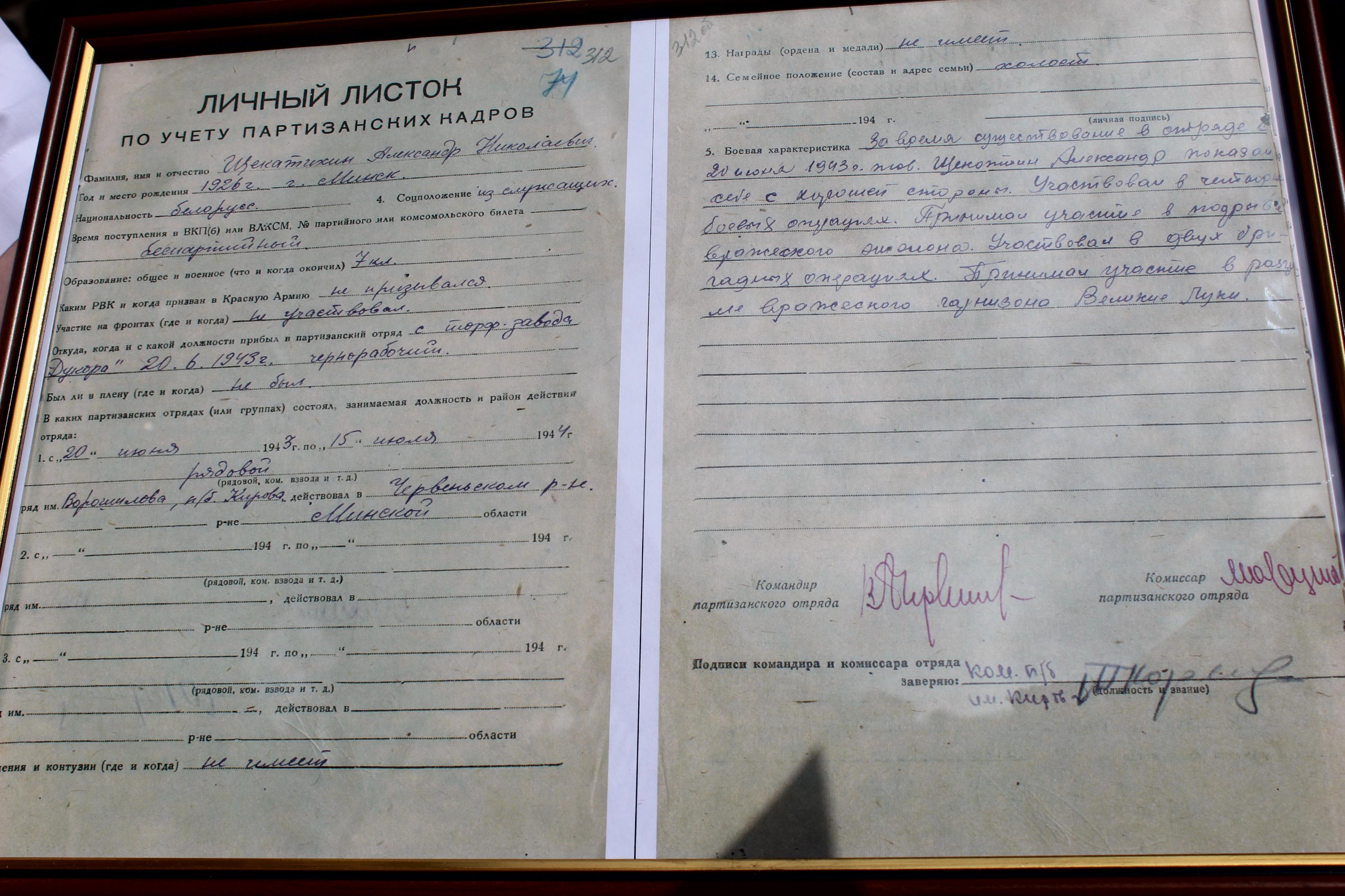 Копия личного листка по учету партизанских кадров, заполненного в партизанском отряде, была вручена Щекатихитну Александру Николаевичу, который будучи чернорабочим на торф заводе «Дукора» в 1943 году прибыл рядовым в партизанский отряд, был участником двух бригадных операций, принял участие в разгроме вражеского гарнизона Великие Луки в Червеньском районе Минской области.