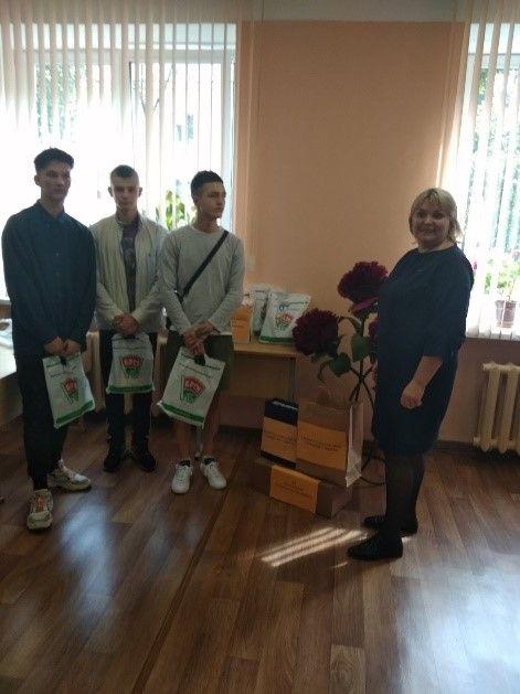 Это обучающиеся УО «Минский государственный профессиональный лицей №14 деревообрабатывающего производства и транспортного обслуживания», с которыми проводится комплексная реабилитация. Наталья Владимировна вручила им канцелярские товары и принадлежности, которые пригодятся подросткам в процессе обучения.