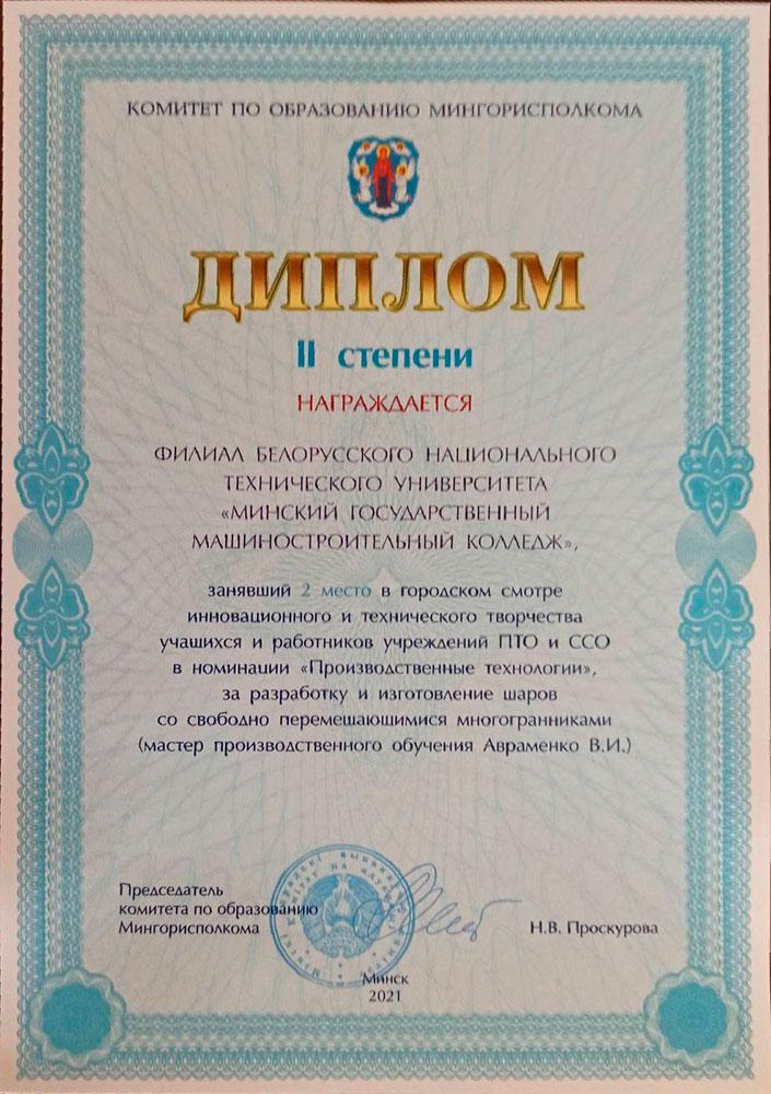 По итогам проведения городского смотра филиал БНТУ «Минский государственный машиностроительный колледж» награжден дипломами комитета по образованию Мингорисполкома:
