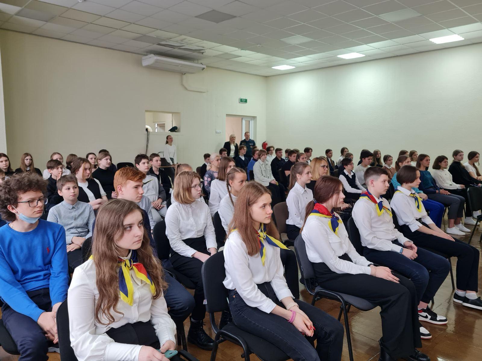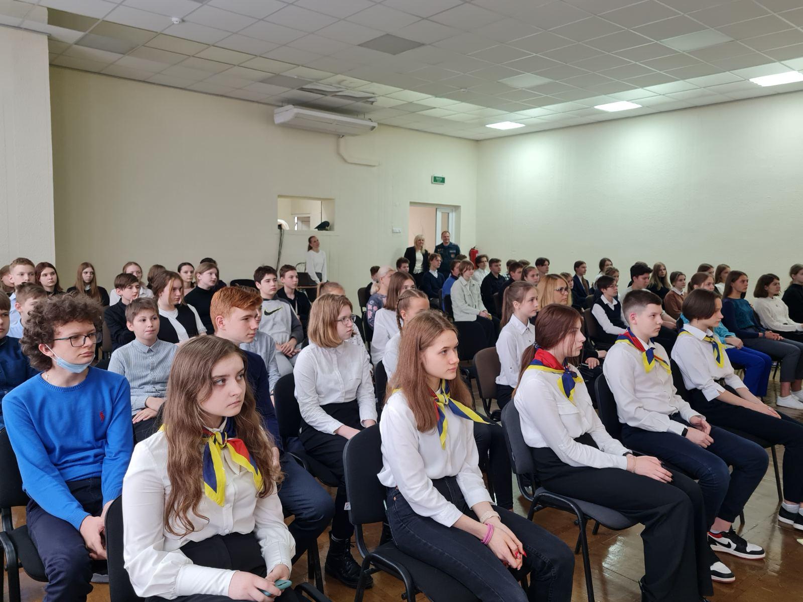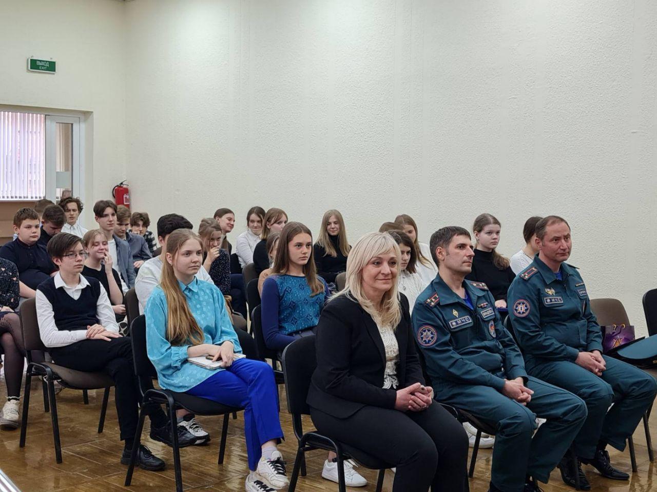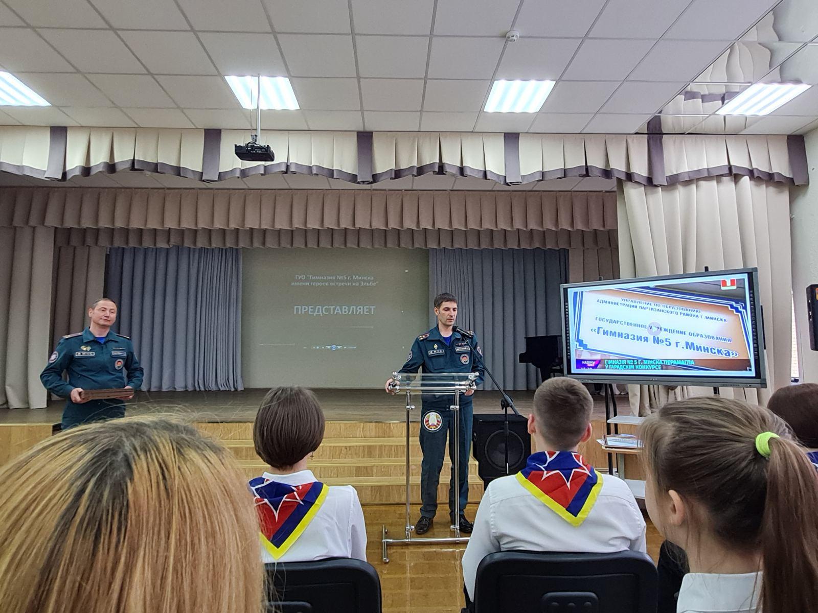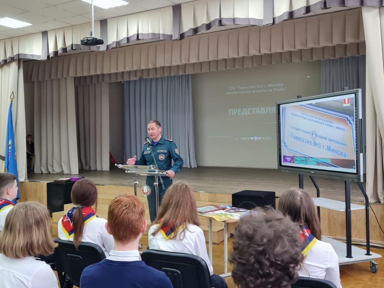 В актовом зале ГУО «Гимназия №5 г. Минска имени героев встречи на Эльбе» в рамках проекта «Школа Активного Гражданина» прошла встреча учащихся учреждения с начальником сектора идеологической работы МЧС Республики Беларусь Александром Бернадским и заместителем начальника Минского городского управления МЧС Андреем Ганусевичем.