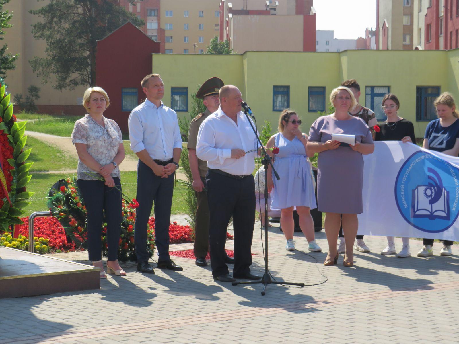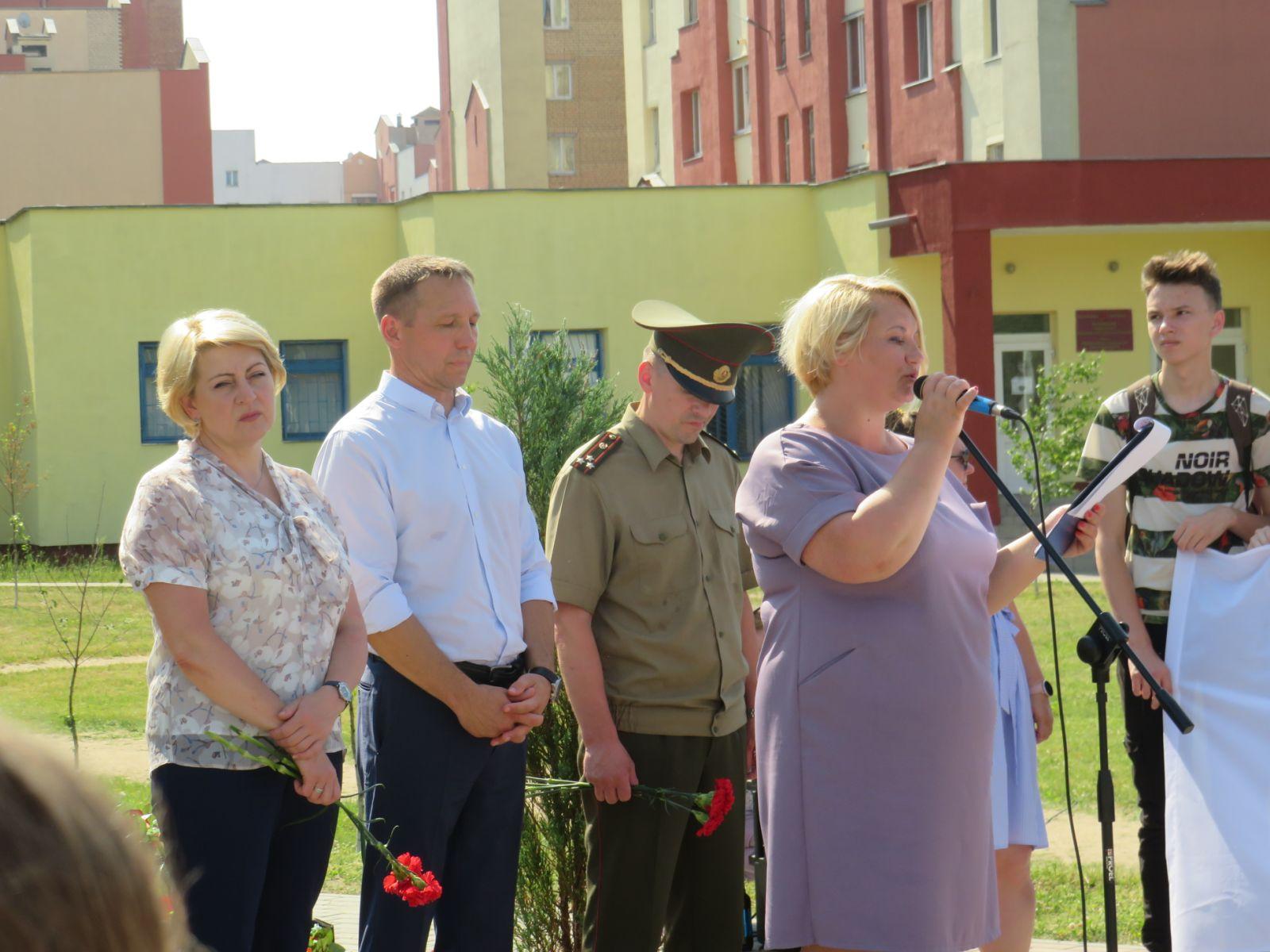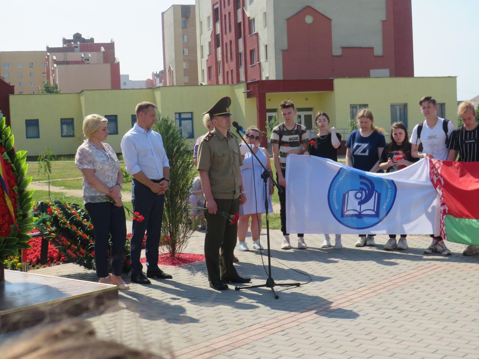 В митинге приняли участие: депутат Минского городского совета депутатов 28 созыва Роман Викторович Никонов, заместитель главы администрации Партизанского района г. Минска Людмила Анатольевна Филиппович, военный комиссар Партизанского района г. Минска Олег Владимирович Рогатень, председатель Партизанской районной г. Минска организации РОО «Белая Русь» Зинаида Ивановна Козловская, член Президиума районного объединения первичных профсоюзных организаций Лия Станиславовна Мякиш, директор ГУО СШ № 223 имени Иона Солтыса Геннадий Альбертович Белявский, учащиеся учреждений образования Партизанского района г. Минска.