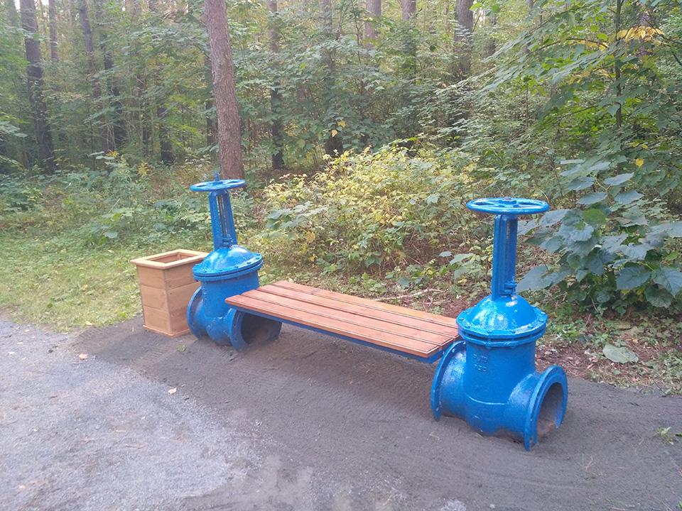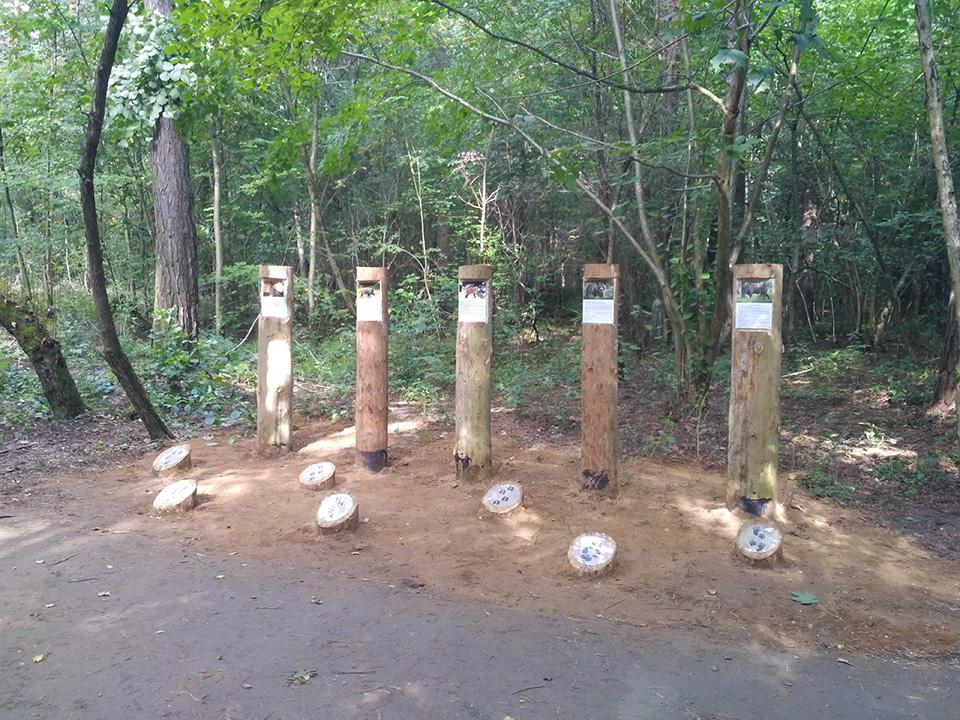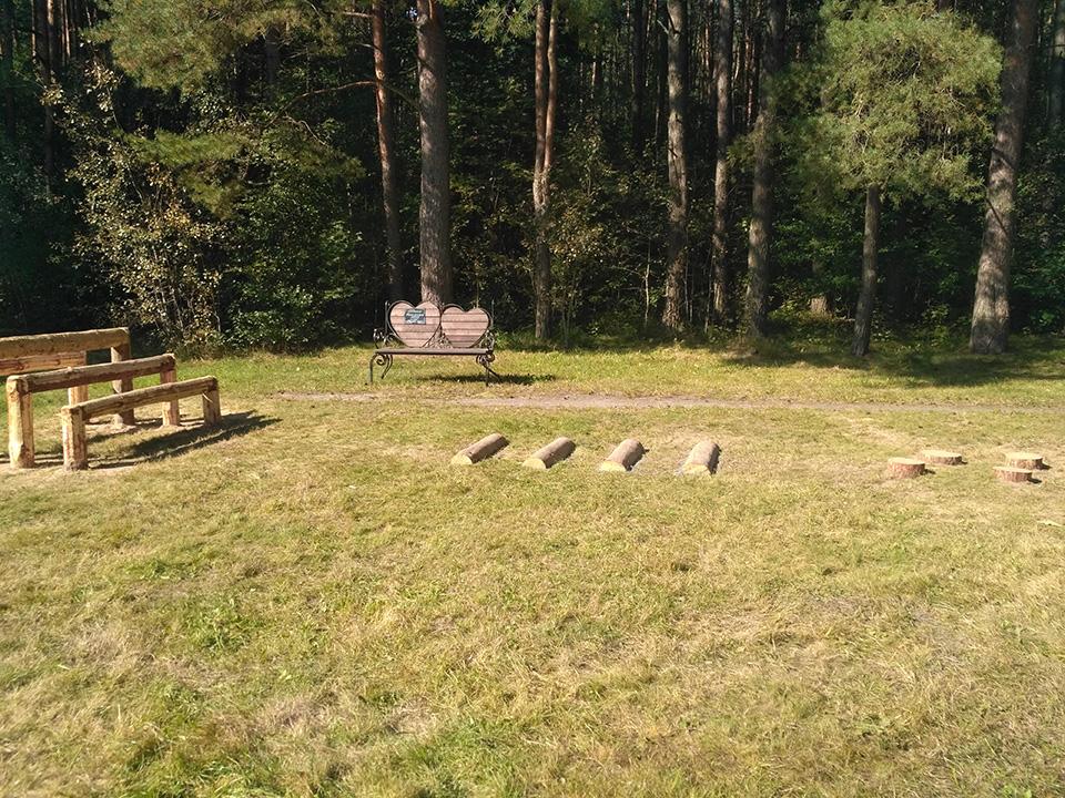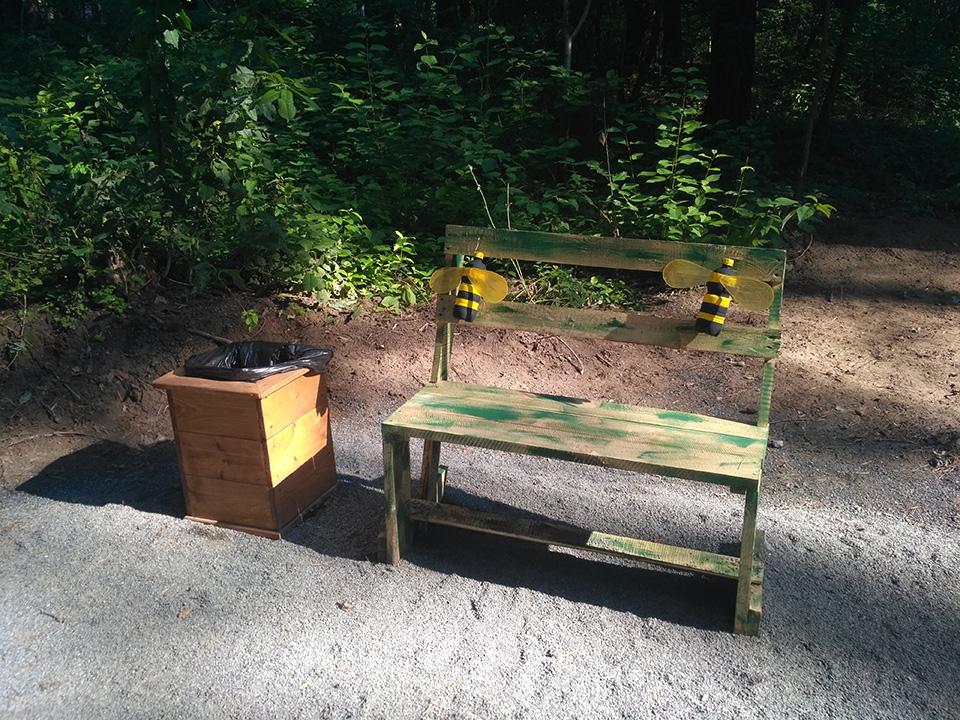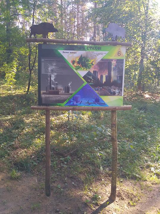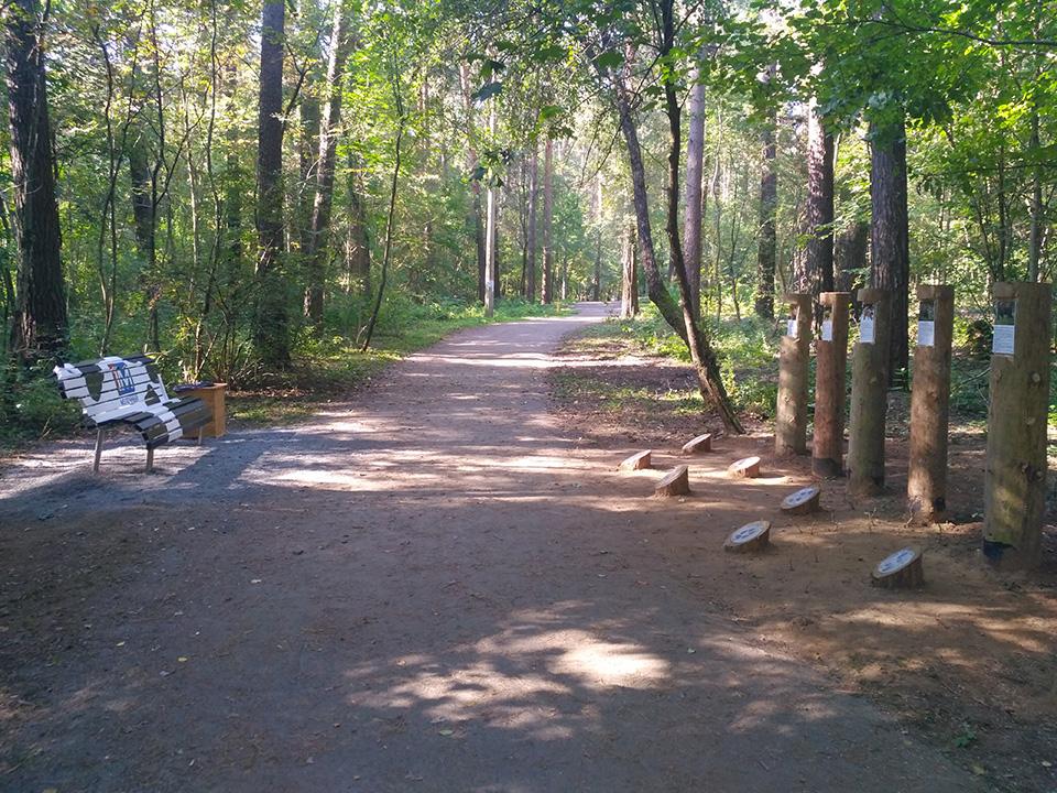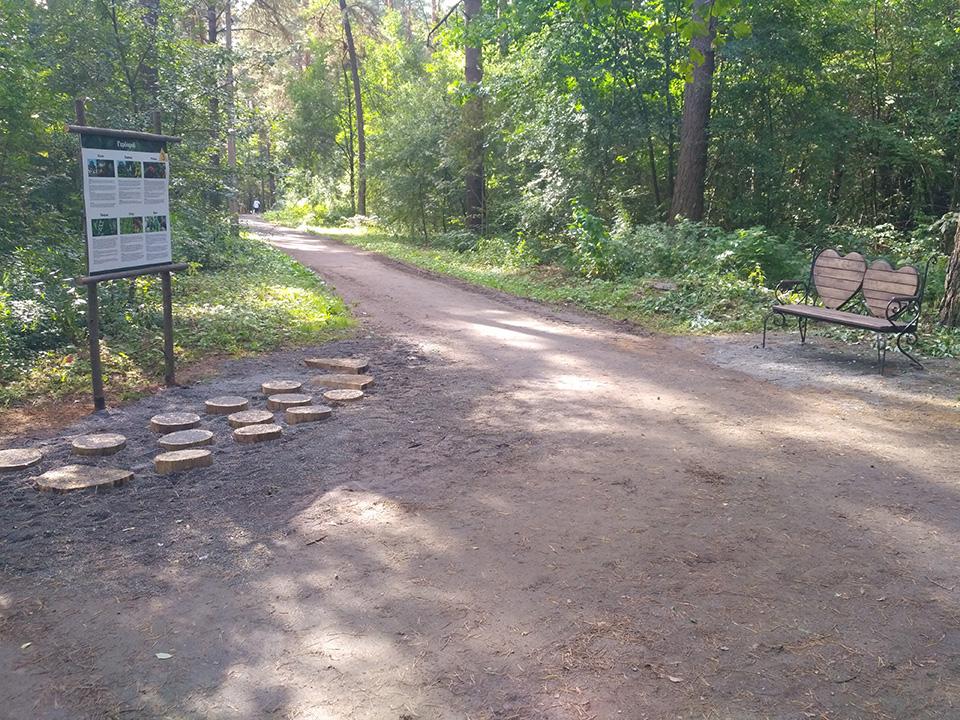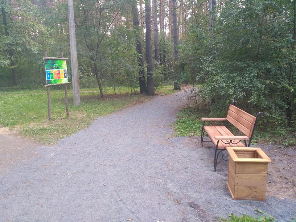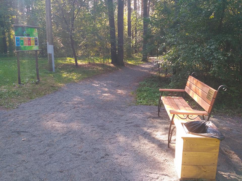 На экологической тропе установлено 20 скамеек, в рамках проведения конкурса на лучшую скамейку в 2021 году, а также размещены 4-ре информационных стенда на темы: информация о произрастающих растениях, информация о раздельном сборе мусора, плакат с правилами поведения в лесопарке и плакат о загрязнении стихий. На данной экологической тропе также имеется одна интерактивная зона «Угадай животное по следу» и одна фотозона «Трон лесовика». У входной группы расположена велосипедная парковка и развивающий детский городок из дерева, также на протяжении всей тропы установлены скворечники, изготовленные детьми во время летних каникул и подаренные району. На прилегающей территории благоустроена волейбольная площадка и отремонтировано спортивное снаряжение (турник, брусья). Навигация по экологической тропе осуществляется при помощи указателей в виде зверей.