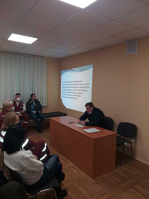 В администрации, структурных подразделениях на 11-ти подстанциях учреждения здравоохранения «Городская станция скорой медицинской помощи» г. Минска, 11.01.2021 прошли диалоговые площадки. Основные предложения, внесенные в проект изменений и дополнений Конституции Республики Беларусь, активно обсуждались в трудовых коллективах.