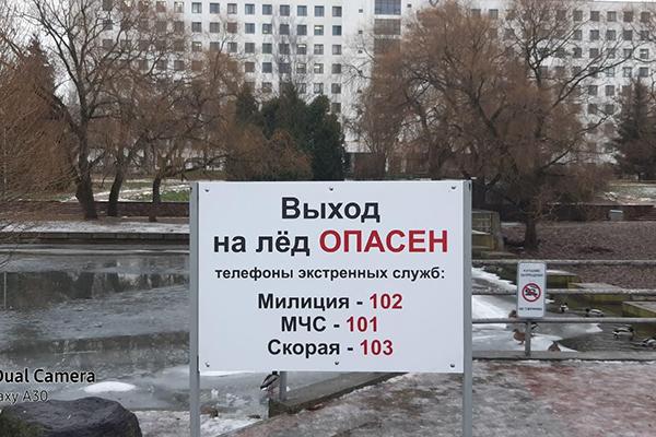 УП «Зеленстрой Партизанского района г. Минска» сообщает, что вдоль канала СВС ул. Парниковая, ул. Филимонова, пер. Козлова, ул. Столетова, пер. Клумова установлены информационные стенды «Выход на лед опасен» в количестве 21 штуки.