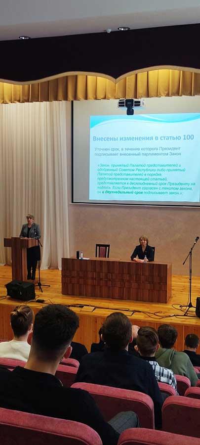 7 февраля 2022 года в УО "Минский государственный профессионально-технический колледж монтажных и подъёмно-транспортных работ" прошёл открытый диалог "Изменения и дополнения Конституции Республики Беларусь" при участии Креч Ольги Зеноновны, члена Постоянной комиссии по законодательству Палаты представителей Национального собрания РБ, и Чернявской Жанны Николаевны, заместителя председателя Постоянной комиссии Палаты представителей Национального собрания РБ по вопросам экологии, природопользования и чернобыльской катастрофы.