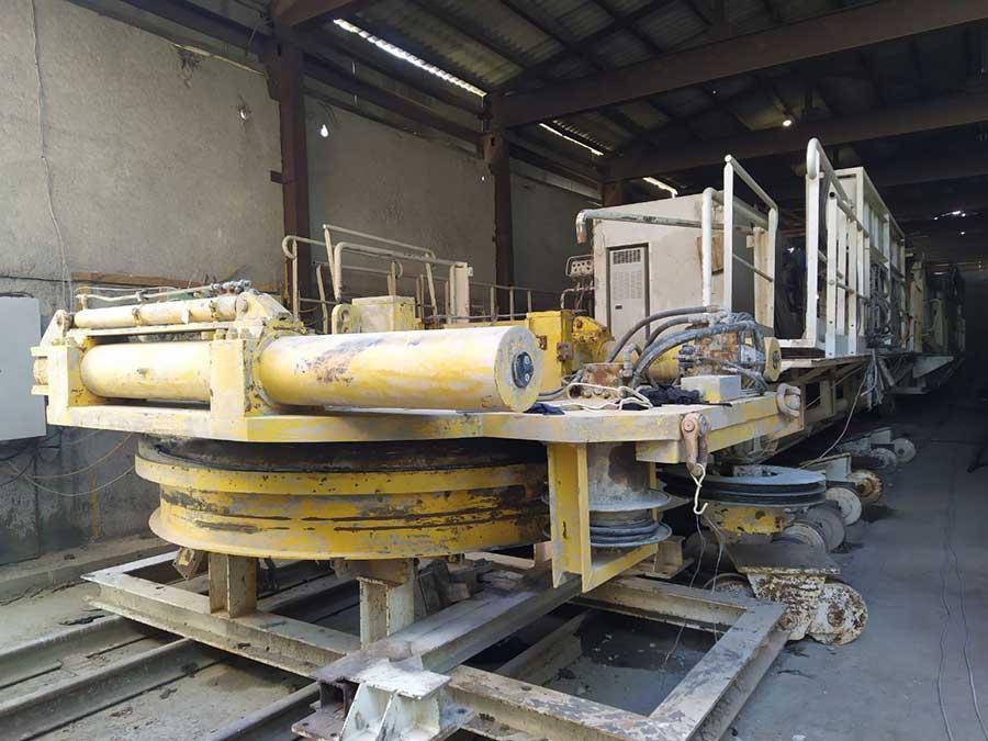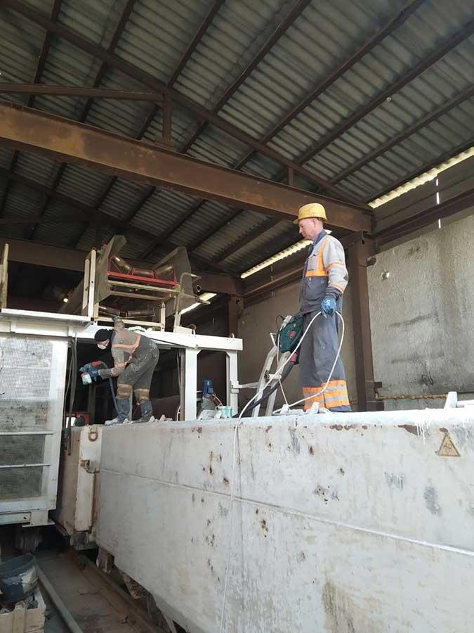 Для нее подготовили специальную площадку с ангаром. Получилось компактно, учитывая 100-метровую протяженность поезда. Снаружи «Алеся» уже покрашена. Антикоррозийной предпокрасочной обработке подвергаются и технологические тележки. Внутренние поверхности комплекса очищаются от бетонных отложений