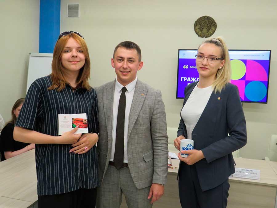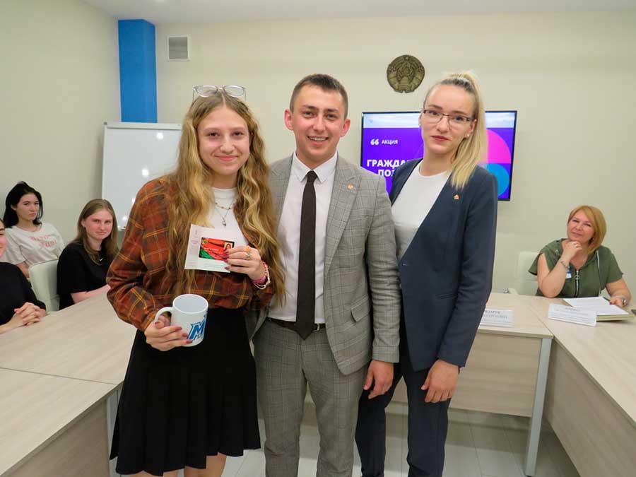 В рамках диалоговой площадки состоялась акция «Гражданская позиция»: 18 обучающихся филиала пополнили ряды ОО «БРСМ», им были вручены билеты, значки и памятные подарки. Также Дипломом 1 степени награждена Ковальчук Юлия участница Международного конкурса компьютерных презентаций «Салют, Победа». Дипломом III степени Министерства образования Республики Беларусь в номинации «Эхо Великой Отечественной войны в истории моей семьи» награждён Кирковец Антон участник Республиканского конкурса проектов гражданско-патриотической направленности: «История моей семьи – Помним. Чтим. Гордимся».