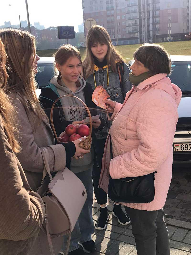 В преддверии Дня пожилых людей, который традиционно отмечается в нашей стране 1 октября, волонтеры из отряда «Доброе сердце» Минского колледжа предпринимательства провели акцию «Пусть годы будут золотыми». Ребята вручили поздравительные открытки и полезные сладости бабушкам и дедушкам прямо на улицах города.
