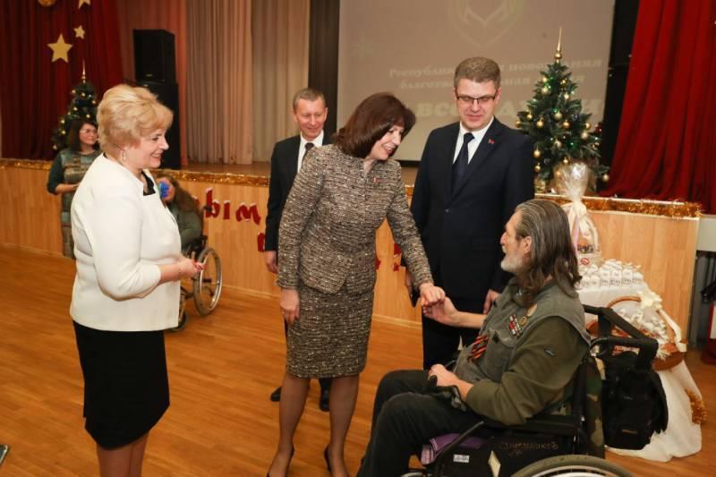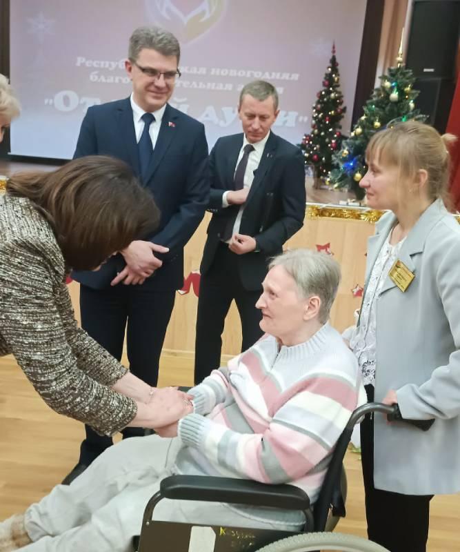 "Эта акция очень важна. В республике сегодня многое делается для людей пожилого возраста. Только в нашем районе проживает около 25 тыс. пожилых людей, которые внесли неоценимый вклад в развитие не только нашего района, города, но и в целом республики. Это уникальные люди. И в нынешнее время молодое поколение должно оказывать им ежедневную помощь, высказывать слова благодарности за то, что мы живем в такой хорошей стране. Ведь они сделали для этого многое, и мы должны ценить их вклад в развитие страны и передать эту благодарность следующим поколениям и дальше развивать наше государство", - сказал Валерий Вороницкий. Дом-интернат для пенсионеров и инвалидов в Минске в рамках республиканской благотворительной акции для пожилых "От всей души" посетила с подарками председатель Совета Республики Наталья Кочанова и председатель Мингорисполкома Владимир Кухарев. Проживающие дома-интерната также подготовили свои творческие подарки.
