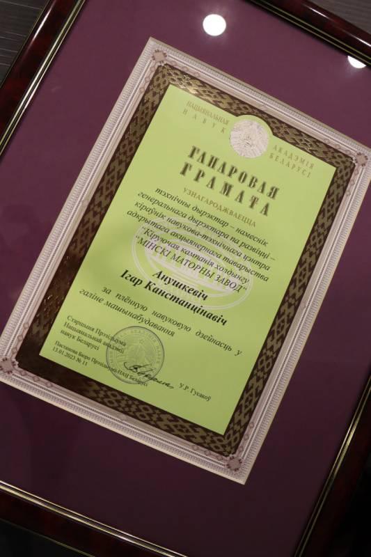 Игорь Анушкевич, технический директор Минского моторного завода, удостоен Почетной грамоты Национальной академии наук Беларуси «За плодотворную научную деятельность в отрасли машиностроения».