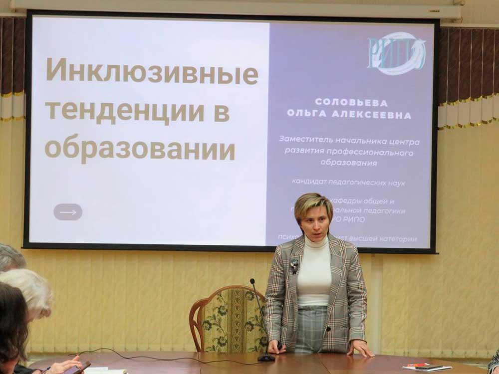 24 января 2023 года для педагогов и мастеров производственного обучения филиала КСТМиА УО РИПО состоялся семинар «Инклюзивные тенденции в образовании» под руководством заместителя начальника центра развития профессионального образования, кандидата педагогических наук, доцента кафедры общей и профессиональной педагогики УО РИПО – Соловьевой Ольги Алексеевны.