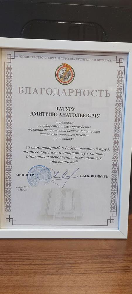 За плодотворный и добросовестный труд, профессионализм и инициативу в работе, образцовое выполнение должностных обязанностей Министром спорта и туризма Республики Беларусь объявлена Благодарность директору ГУ «СДЮШОР по теннису» Татуру Дмитрию Анатольевичу.