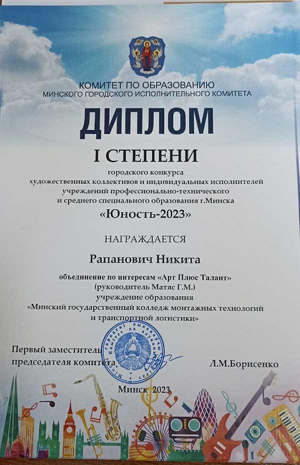 ДИПЛОМ 1 степени - Рапанович Никита.