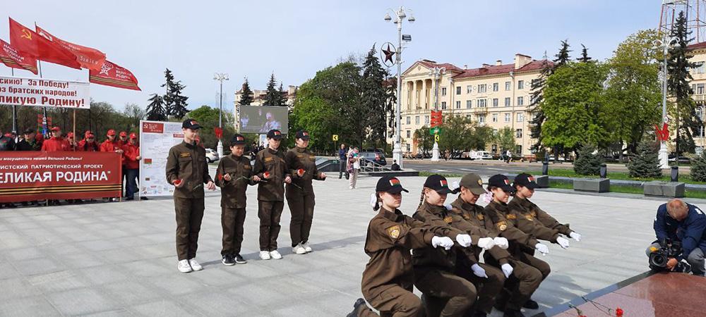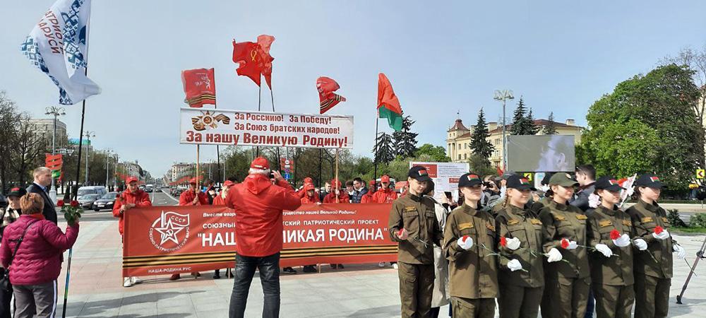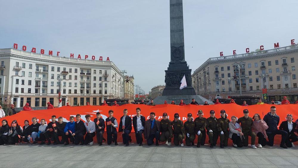 Утром участники в сопровождении «Патриотов Беларуси» и ребят из военно-патриотического клуба #ОРЛЯТА_НАСЛЕДНИКИ_ПОБЕДЫ собрались в самом сердце Минска – у Вечного огня на Площади Победы. Возложили цветы и развернули масштабную копию Знамени Победы – размером в 200 квадратных метров. Сохранение исторической памяти, недопущение оправдания и реабилитации нацизма – то, что объединяет единомышленников.
